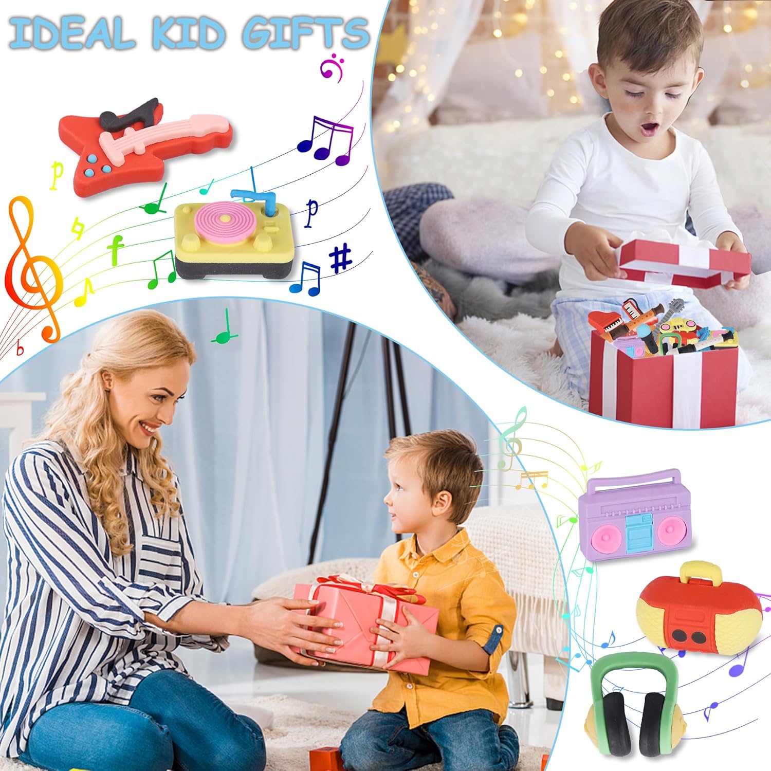 - Musical Instrument Series Cute Erasers: This set includes 24 erasers in total, featuring 12 unique styles themed around different musical instruments. The cute and fashionable shapes include microphones, guitars, electric guitars, radios, stereos, pianos, keyboards, headphones and more, making kids feel fun during use.