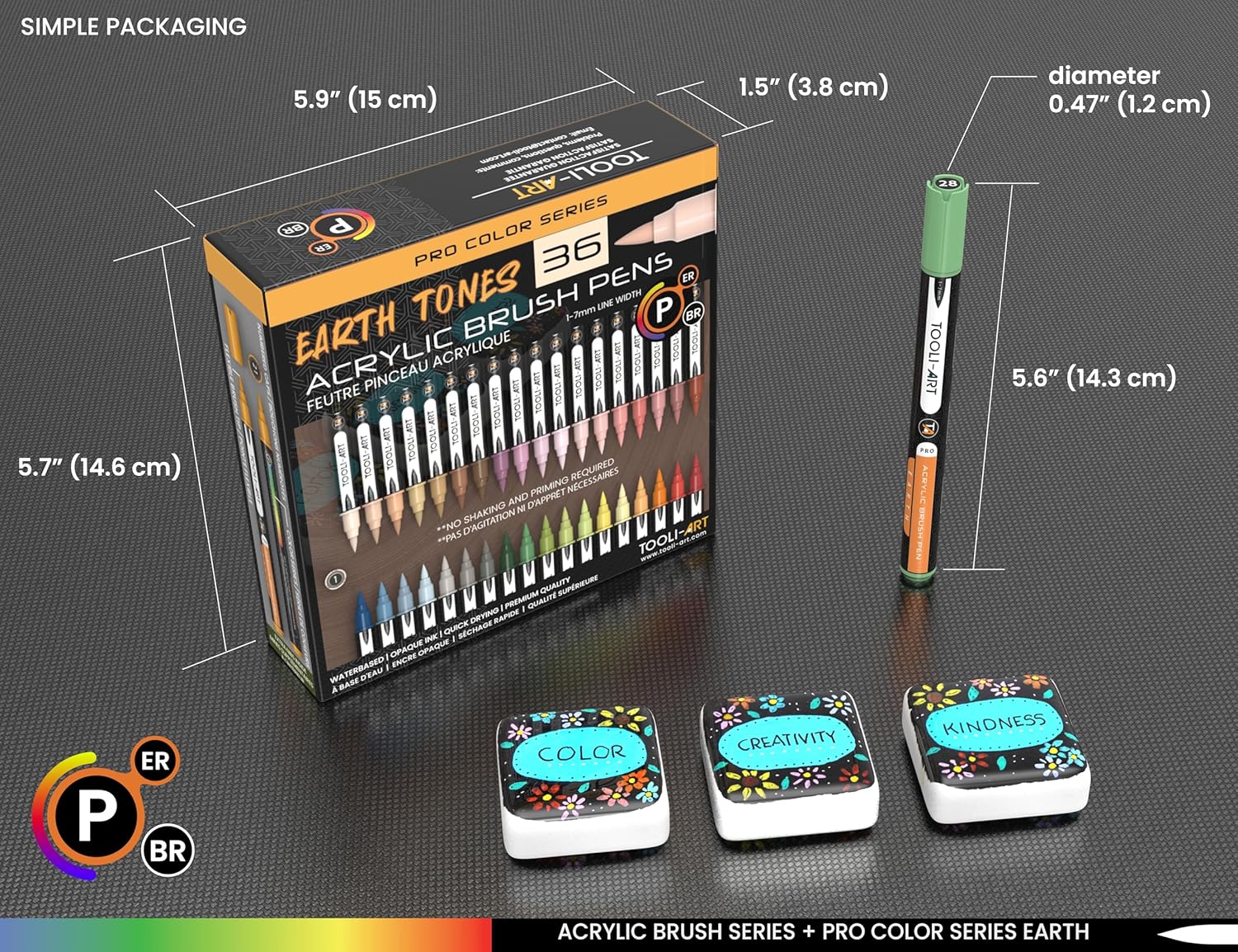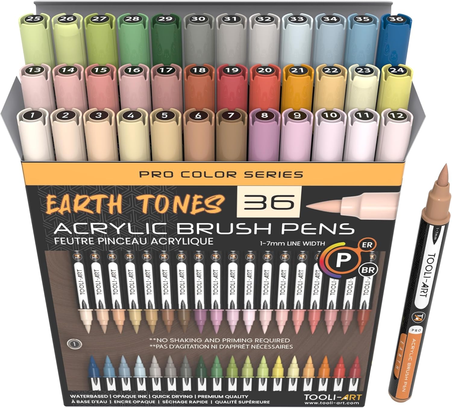 36 Flexible Brush Tip Earth Tones Acrylic Paint Pens Markers Set 1-7mm Line for Rock Painting, Brush Lettering, Glass, Mugs, Wood, Metal, Canvas, Fabric, Plastic. Non Toxic Waterbased Quick Drying