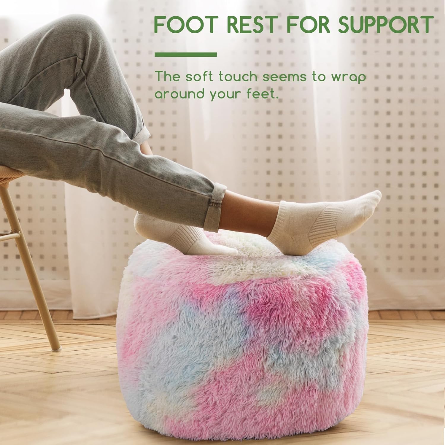 HIGOGOGO Round Stuffed Pouf Ottoman, Long Faux Fur Poufs with Foam Chunk Filling, Fluffy and Furry Pouf Foot Stool Storage Ottoman, 20 X 15 Floor Poufs Foot Rest for Living Room, Rainbow