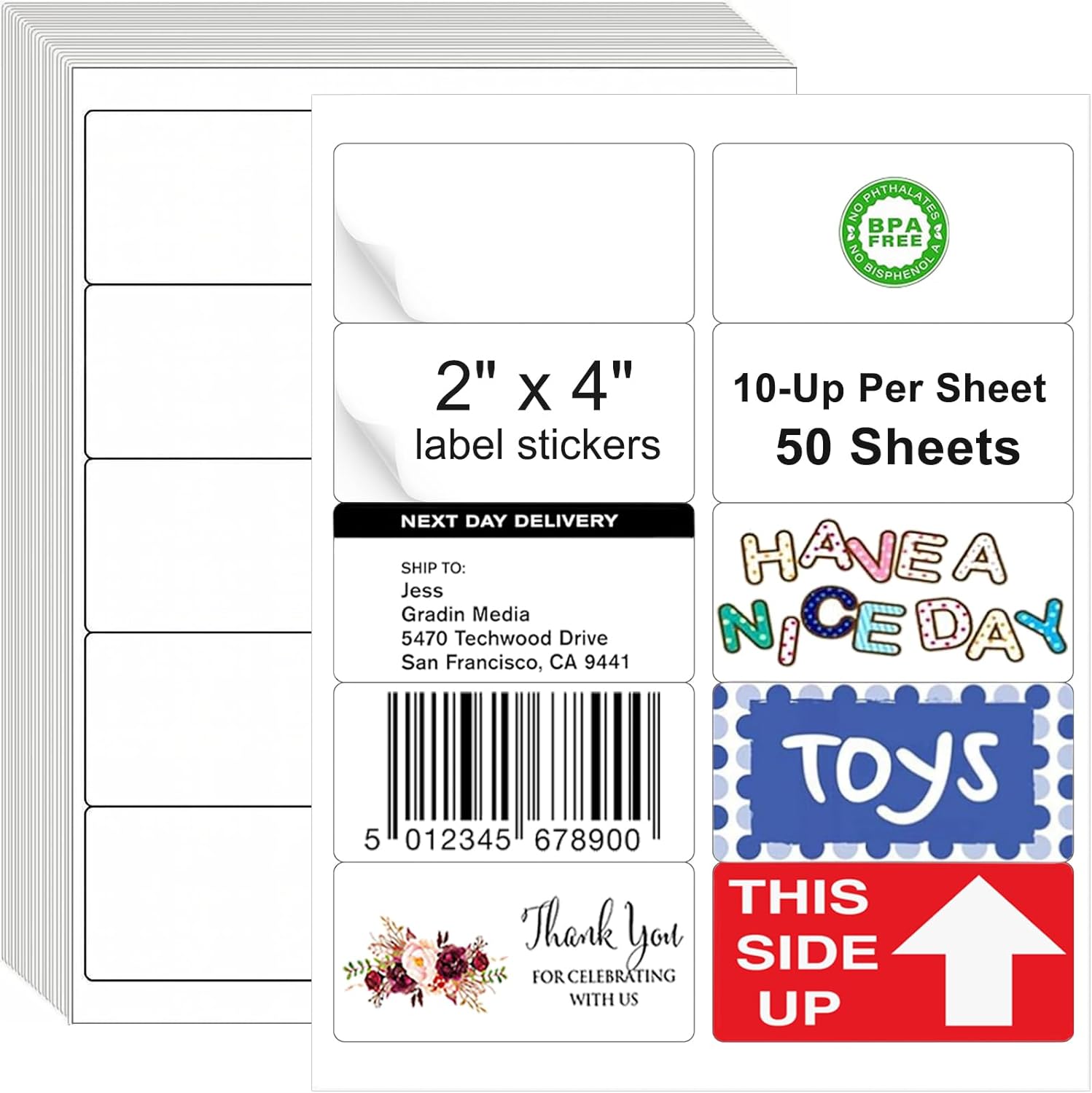 - Label Stickers: The size of each label printer sticker is 2x4 inches, stikcer paper size: 8.5 x 11 inches (US letter size), 10 up small label Per sheet, 50 sheets (500 matte printable sticker labels). The 2 x 4 address label is suitable for most standard mailing and shipping requirements. And the label stickers supports color printing and handwriting, and is also very suitable as a mailing labels for envelopes, address labels, barcode labels, product label and sticker making