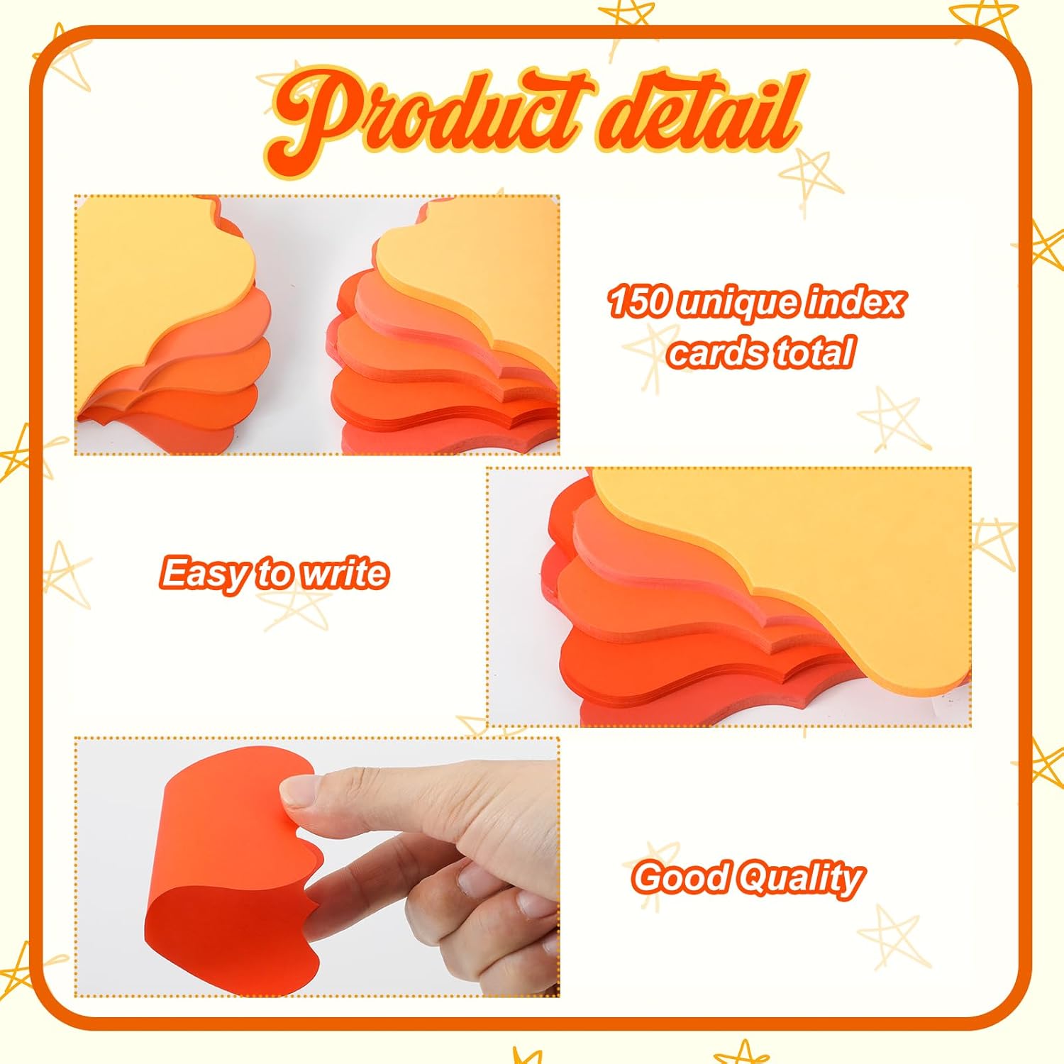 - 2. High quality orange blank cards: These message note cards are made of high quality paper, which is tough and thick. The heavy notecards are blank on both sides, and the study note cards have a smooth surface, which is convenient for writing your notes and work requirements. Memo cards can also be used as recipes, suitable for daily home use.