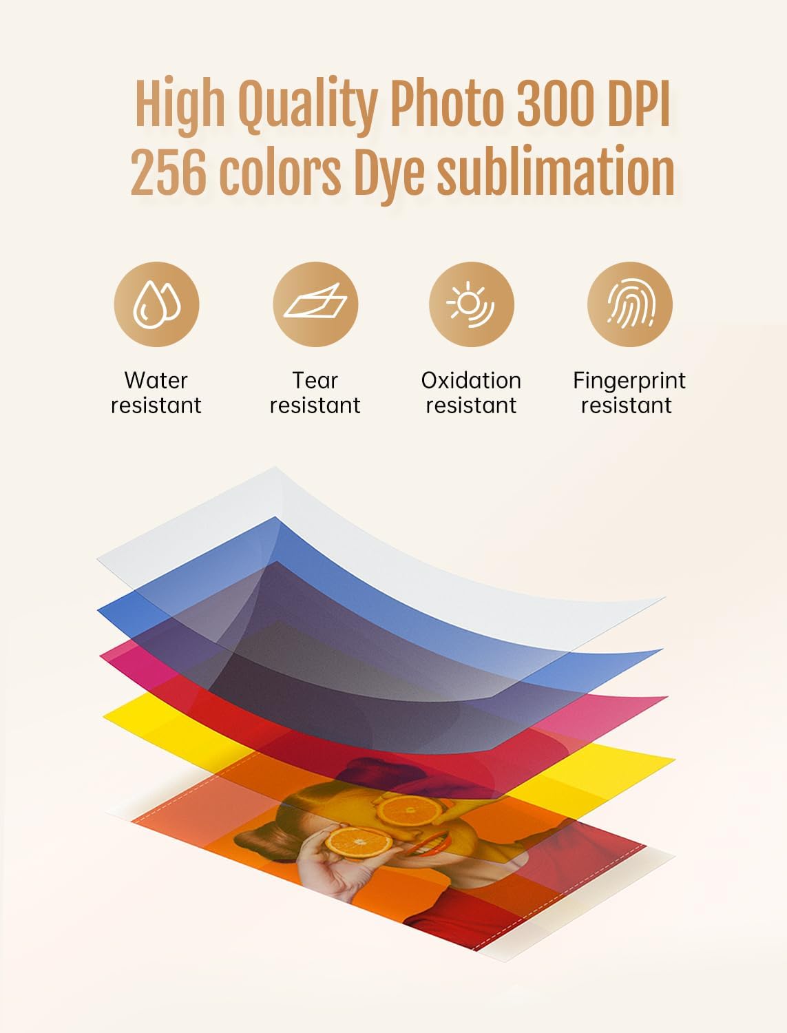 - High Quality Photos: The HPRT CP4100 sublimation printer 4"x6" uses advanced thermal dye sublimation technology with a display resolution of 300 DPI and a color gradation of 256 colors to bring your photo prints to life in brilliant color. The HPRT photo printer coats your precious photos with a protective film that will keep them intact for a long time, preventing water damage, scratches and fading. It's the perfect Father's Day gift for you. Together we will make the most precious memories that will never fade away