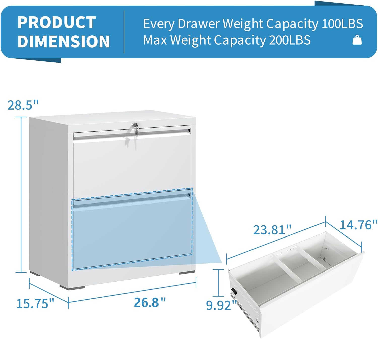 2 Drawer Lateral File Cabinet with Lock, 26.8" Wide Metal Filing Cabinets for Home Office, Steel Storage File Cabinet for Letter/Legal/F4/A4 Size with Hanging Bars, Assembly Required(White)