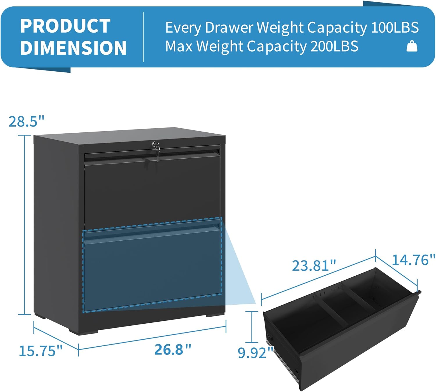 2 Drawer Lateral File Cabinet with Lock, 26.8" Wide Metal Filing Cabinets for Home Office, Steel Storage File Cabinet for Letter/Legal/F4/A4 Size with Hanging Bars, Assembly Required(Black)