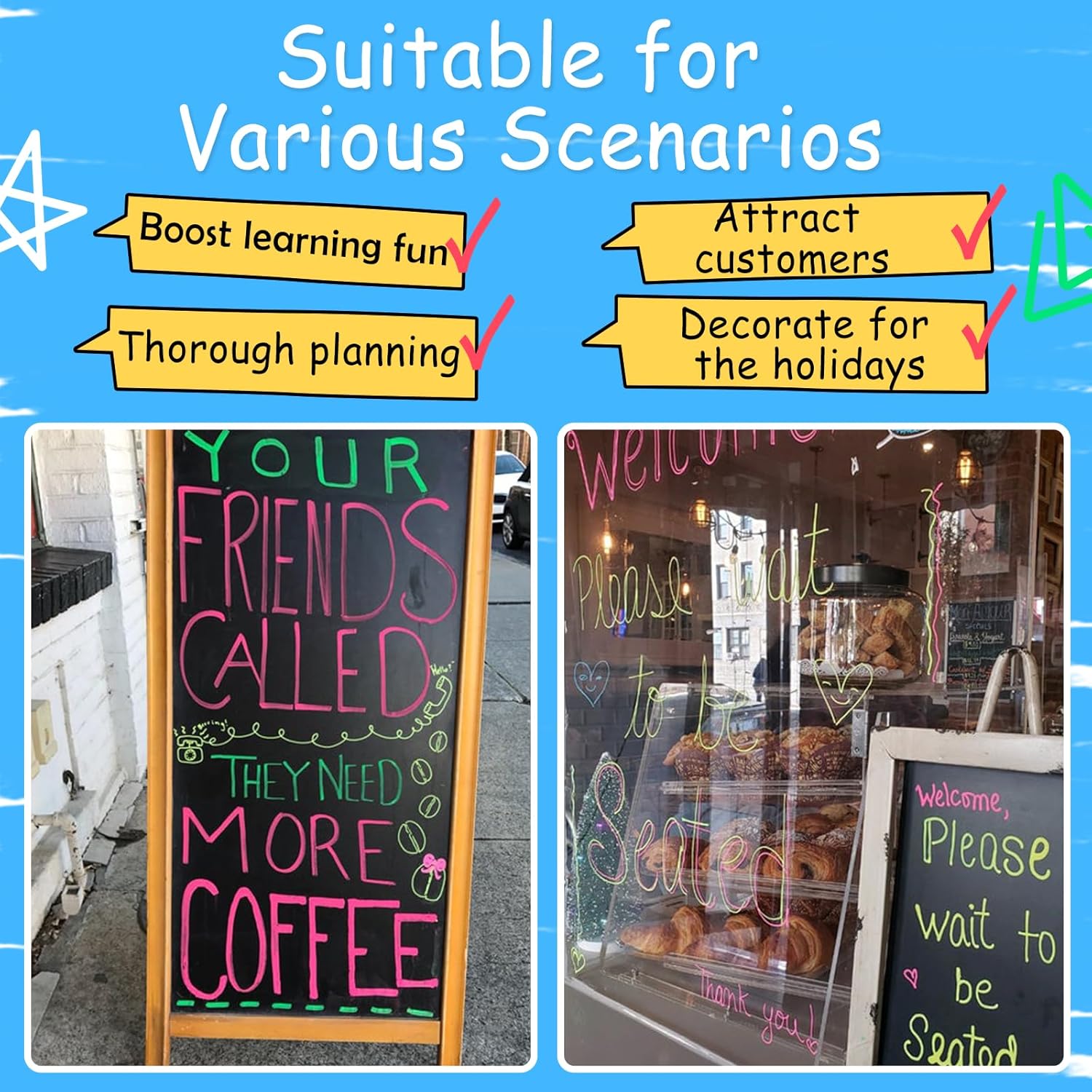 - Versatile Liquid Chalk Markers: These chalk pens are perfect for use on blackboards, whiteboards, windows, glass, mirrors, small chalkboards, car windows, and even as drink markers, making them ideal for back-to-school, office, home, and creative projects.