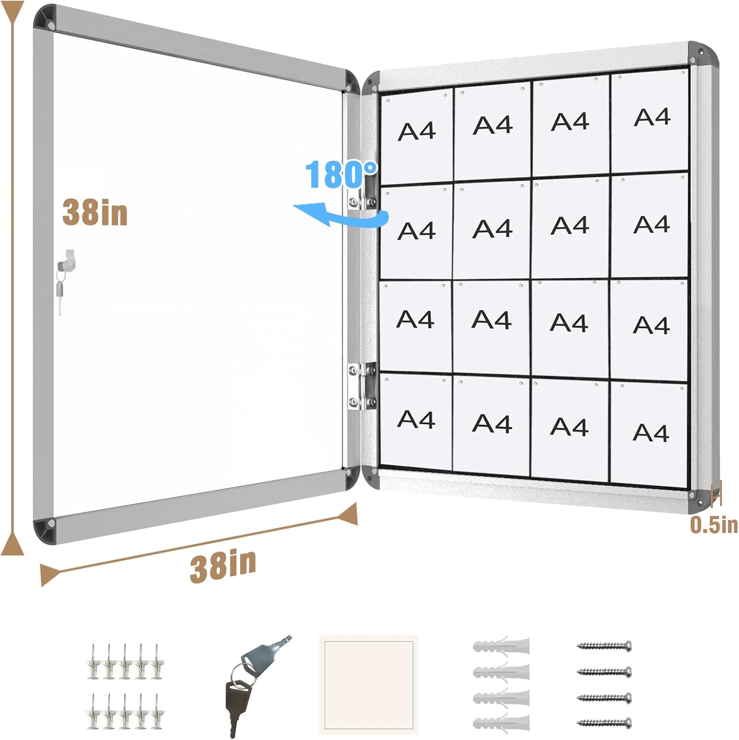 - 🌟✔【Optimal Dimensions】: The overall size of the enclosed bulletin board is 38" x 38" (frame included), with a lockable surface size of 36" x 36". You can display up to 12 A4 size documents at once. The package includes a fixing device and accessories (10 push pins).