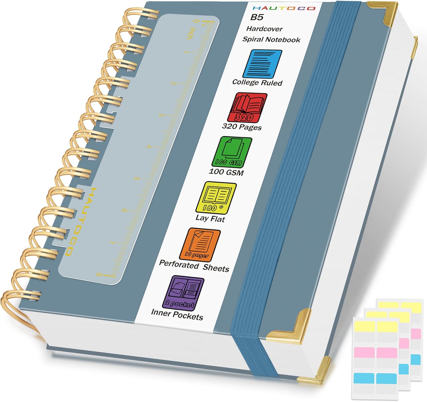 HAUTOCO Spiral Notebook College Ruled B5 Leather Bound Journal, 320 Pages, Hardcover Notebooks with tabs, 100 GSM Paper, 7"x 9.7" Lined Journaling Notebooks for Work Office School Business, Airy Blue