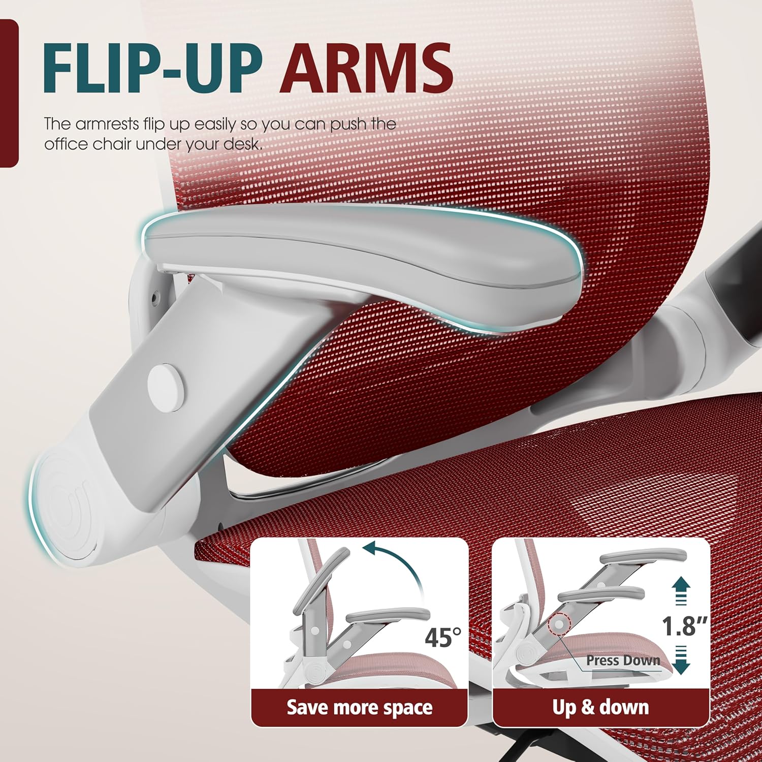 - 【ADJUSTABLE FLIP-UP ARMS】-If you want to make the most of the space under the table or choose a home desk chair for a small space/bedroom, this is the office chair for you! The GABRYLLY ergonomic office mesh chairs' armrest can be folded up(45°) and be adjusted the arms' height(1.8'').