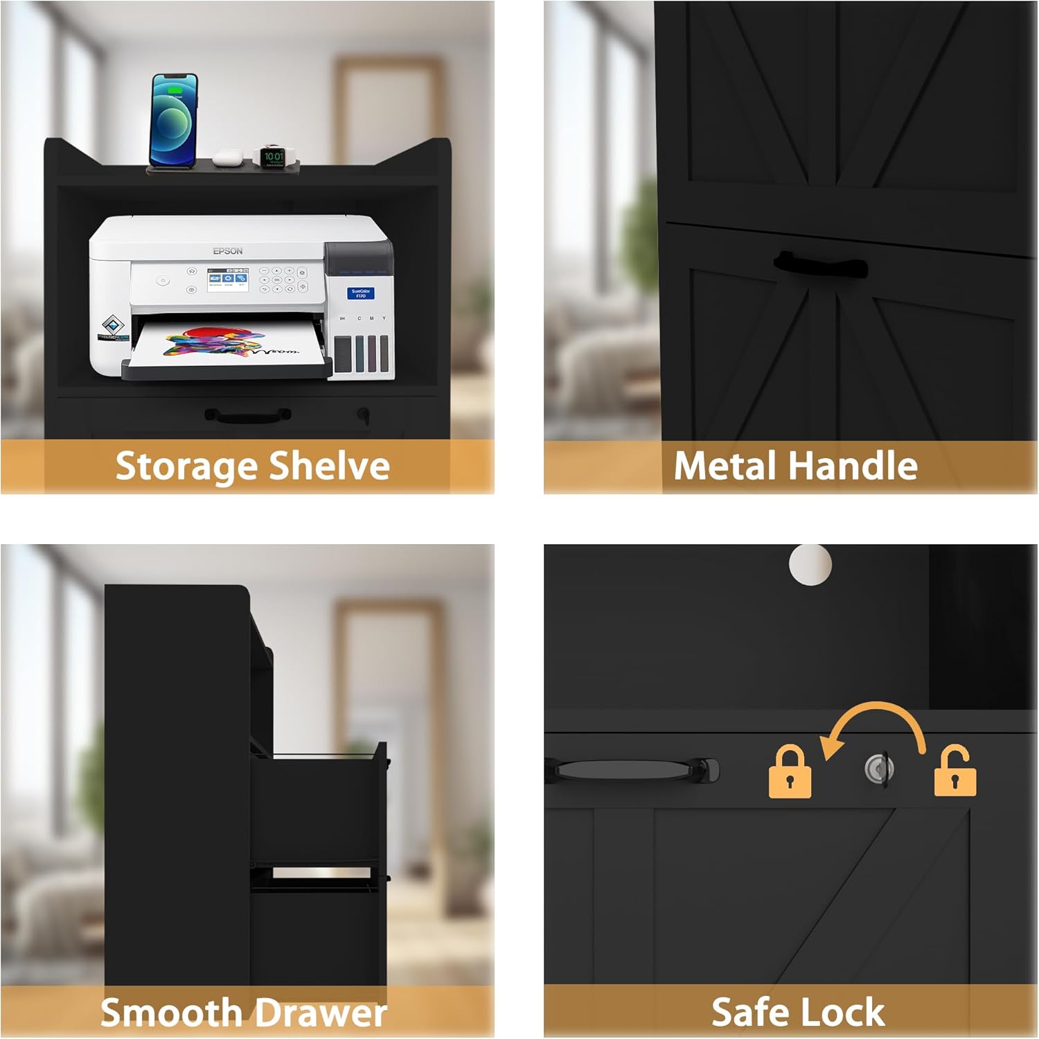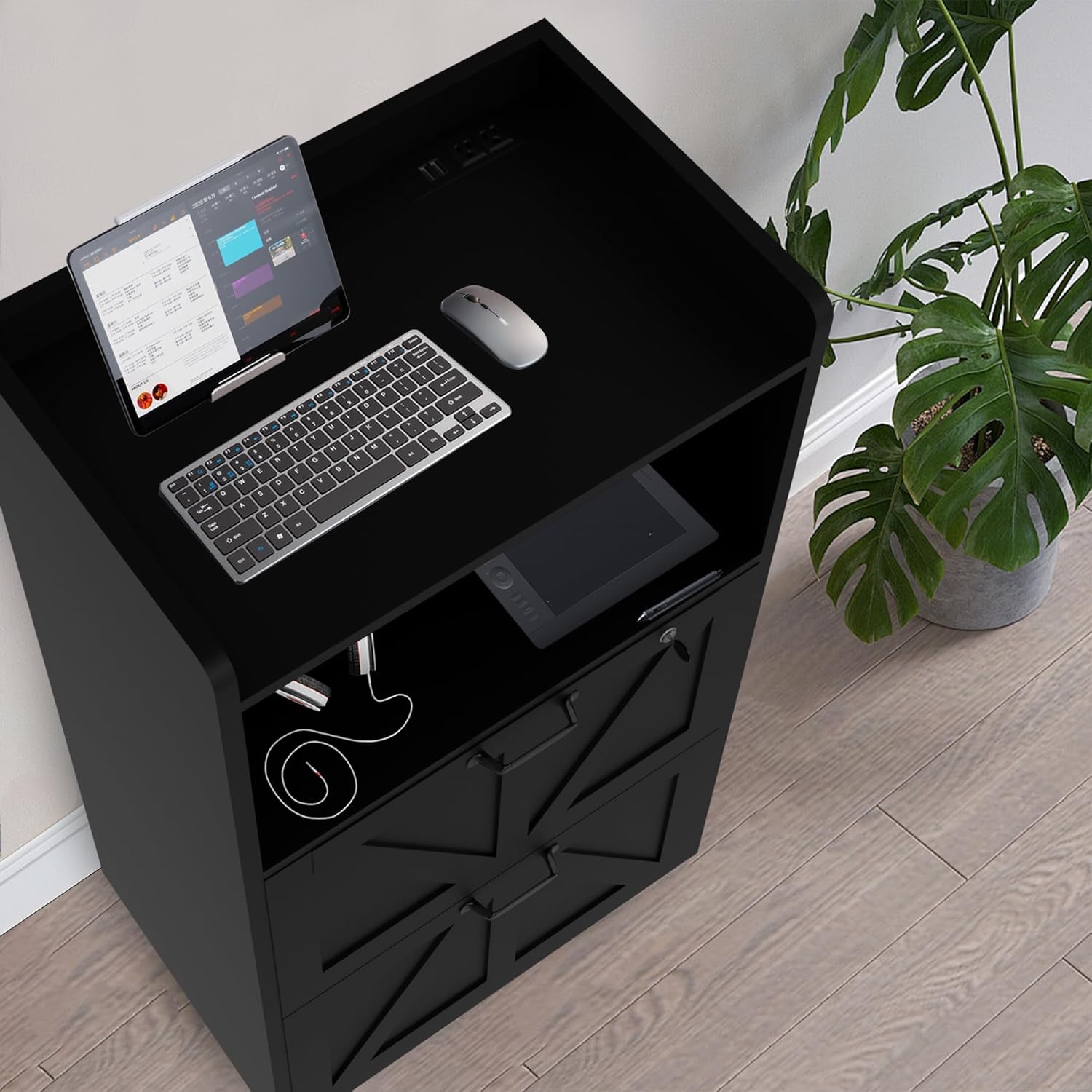 2 Drawer Lateral File Cabinet with Charging Station, Wood Filing Cabinet with Lock & LED Light, Large Storage Printer Stand for Home Office, Black
