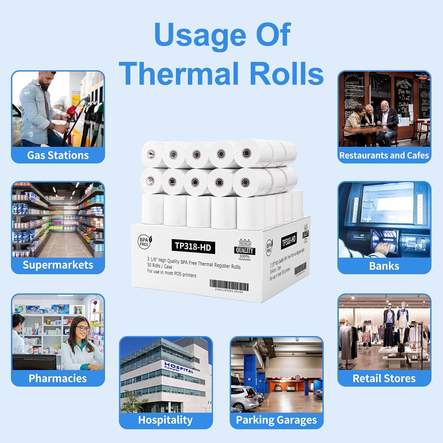 3 1/8 x 230 Thermal Paper Receipt Rolls (50 Pack) 55 GSM Premium Quality, BPA Free Receipt Paper Compatible with Most POS Systems, Cash Registers, Thermal Receipt Rolls