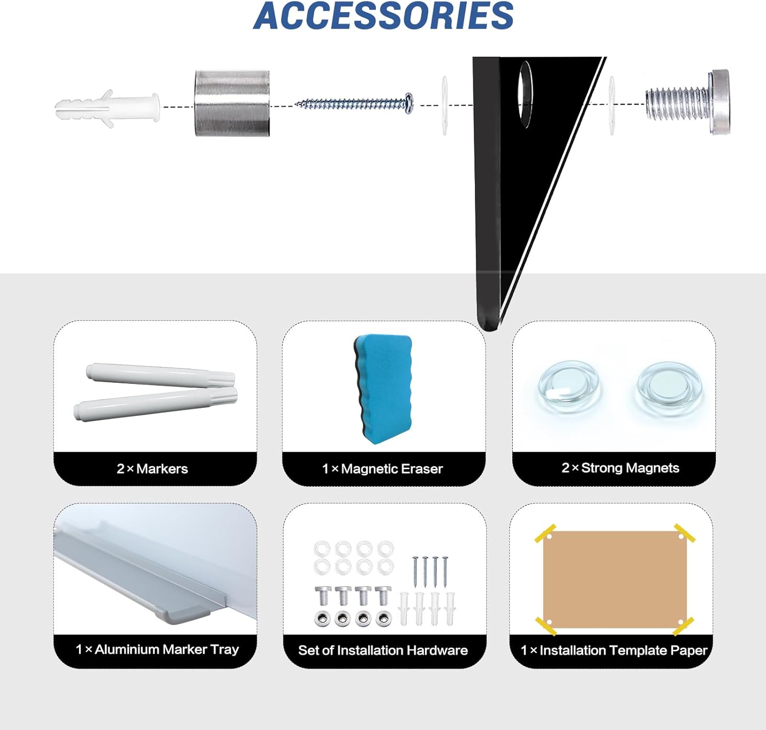 - Setting up your new glass whiteboard is a breeze with our straightforward installation process. Mounting hardware is included, allowing you to quickly and securely affix the board to any wall.