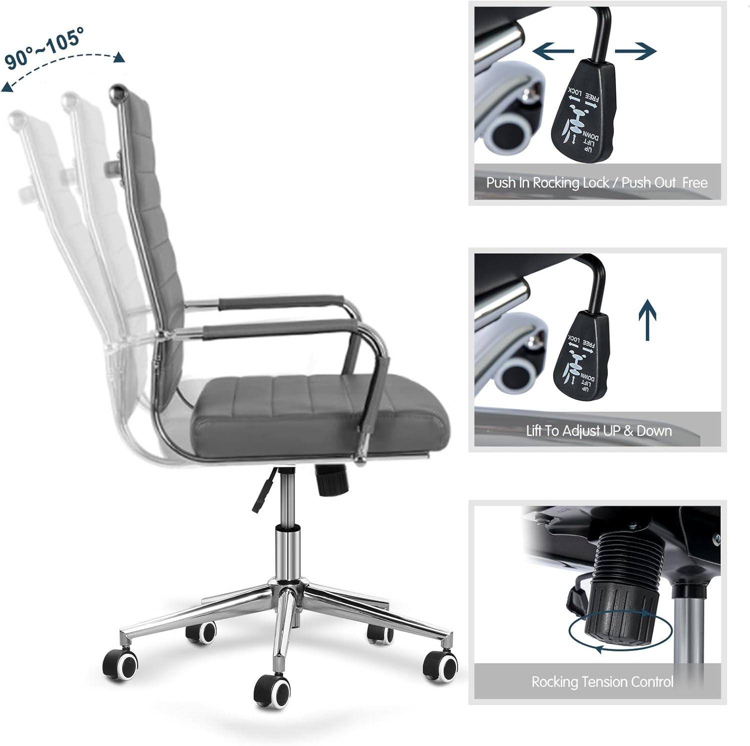 Home Office Chair Ribbed, Modern Leather Conference Waiting Room Chairs,Ergonomic Office Desk Chair, High Back Executive Computer Chair, Adjustable Swivel Chair with Arms (Gray)