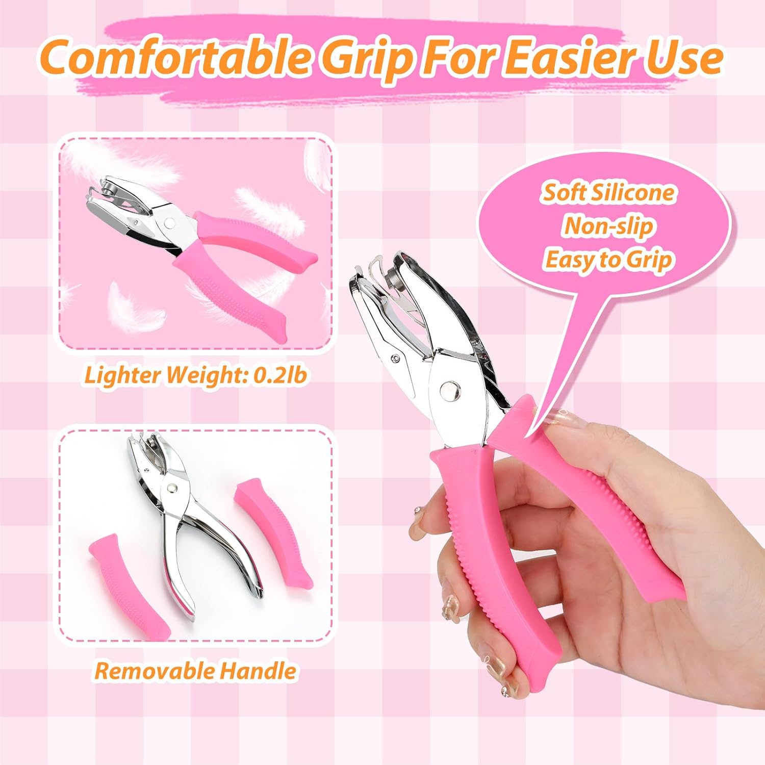 - 【SOFT & NON-SLIP SILICONE GLOVES】Unlike pure metal hole punch, our kids hole punch is equipped with 2 soft silicone handles, the surface of the handles have fine small particles design, not only effective non-slip, but also hold the handles hard to press the holes when punching, like a massage for the palms of your hands, so that people feel relaxed and comfortable. Even if you use this hole punch for a long time, your hand will not be sore.
