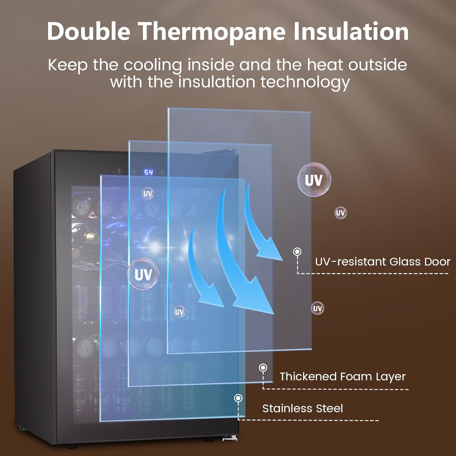 - [Freestanding Wine Cooler]: Provide easy access to wine and beverages without taking up much space. A stylish addition in your man cave, basement, game room, home bar garage, or any other space where you like to relax and enjoy a cold drink.