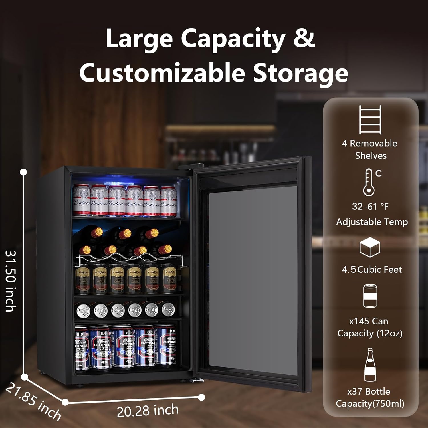- [Versatile Beverage Storage]: Whether you are preparing for a party or you want to enjoy fresh drinks anytime, the 4.5 cu.ft beverage refrigerator can fit up to 145 standard cans! Fresh, cool beverage anytime!
