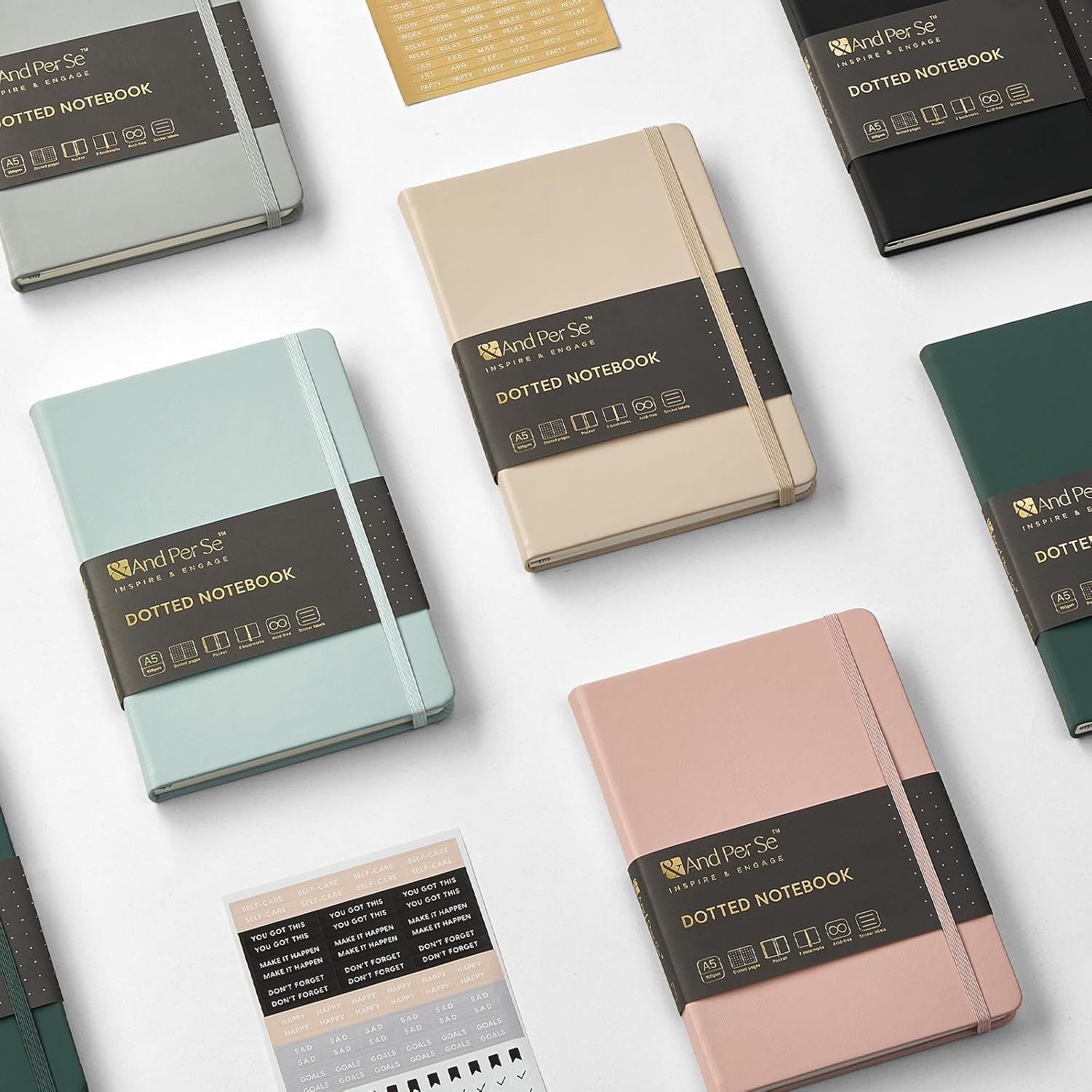 &And Per Se Dotted Journal Notebook (5 Packs), A5 Hardcover Leather Dotted Journal, 160 Pages 100 gsm Thick Paper, 3 Sheets of Stickers Included- 5.7'' x 8'' (Cyan