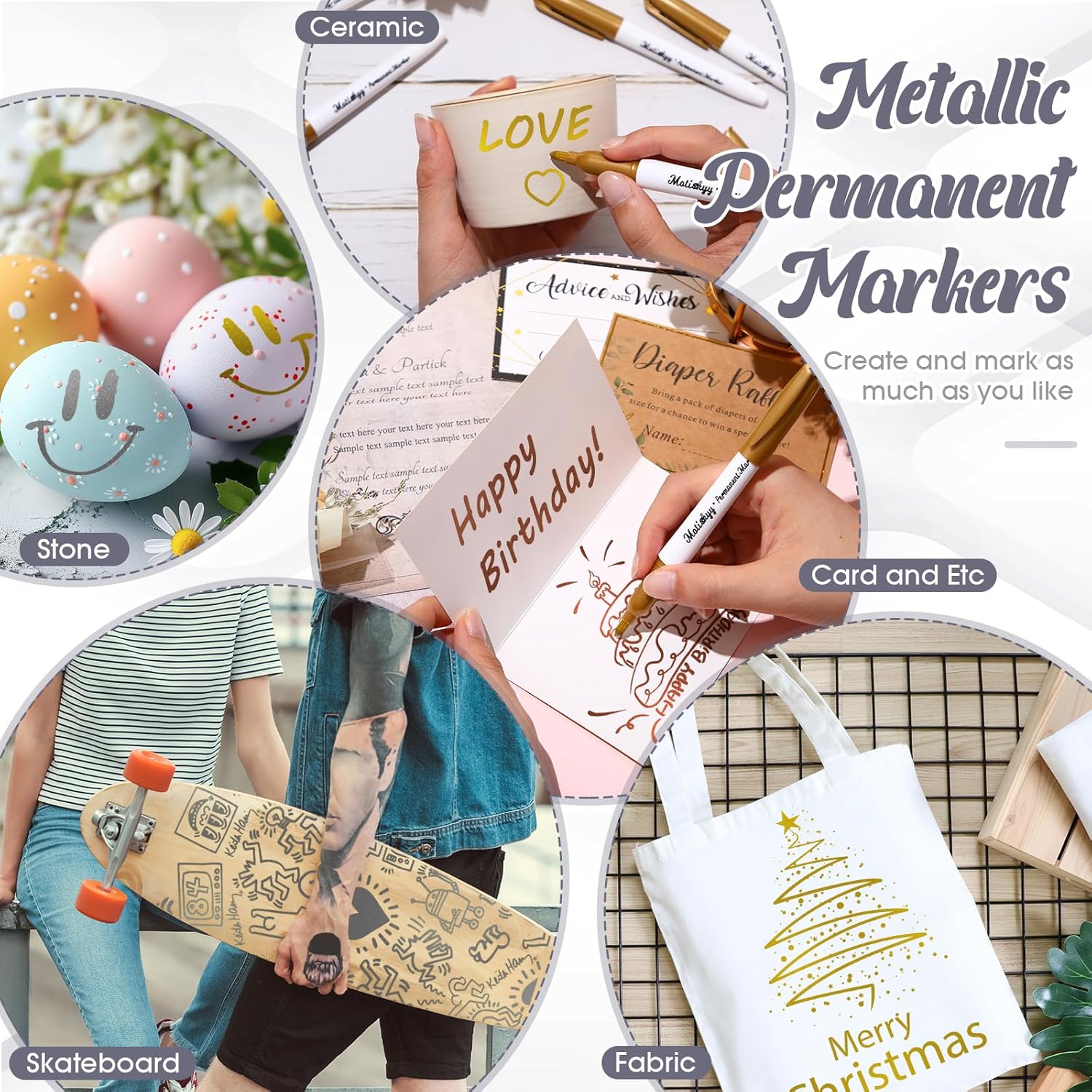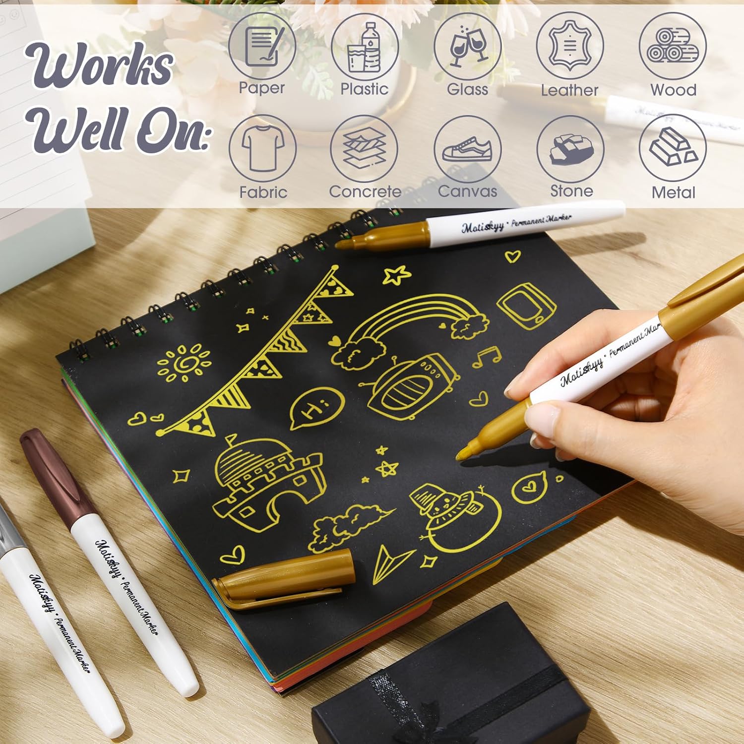 - Marks on Most Surfaces: Versatile gold metallic marker pens can create on a variety of dark and light surfaces, such as paper, wood, enamel, black paper, sketch paper, canvas, wood, brick, stone, glass, mirror, window, metal, plastic, ceramic, fabric and other crafts
