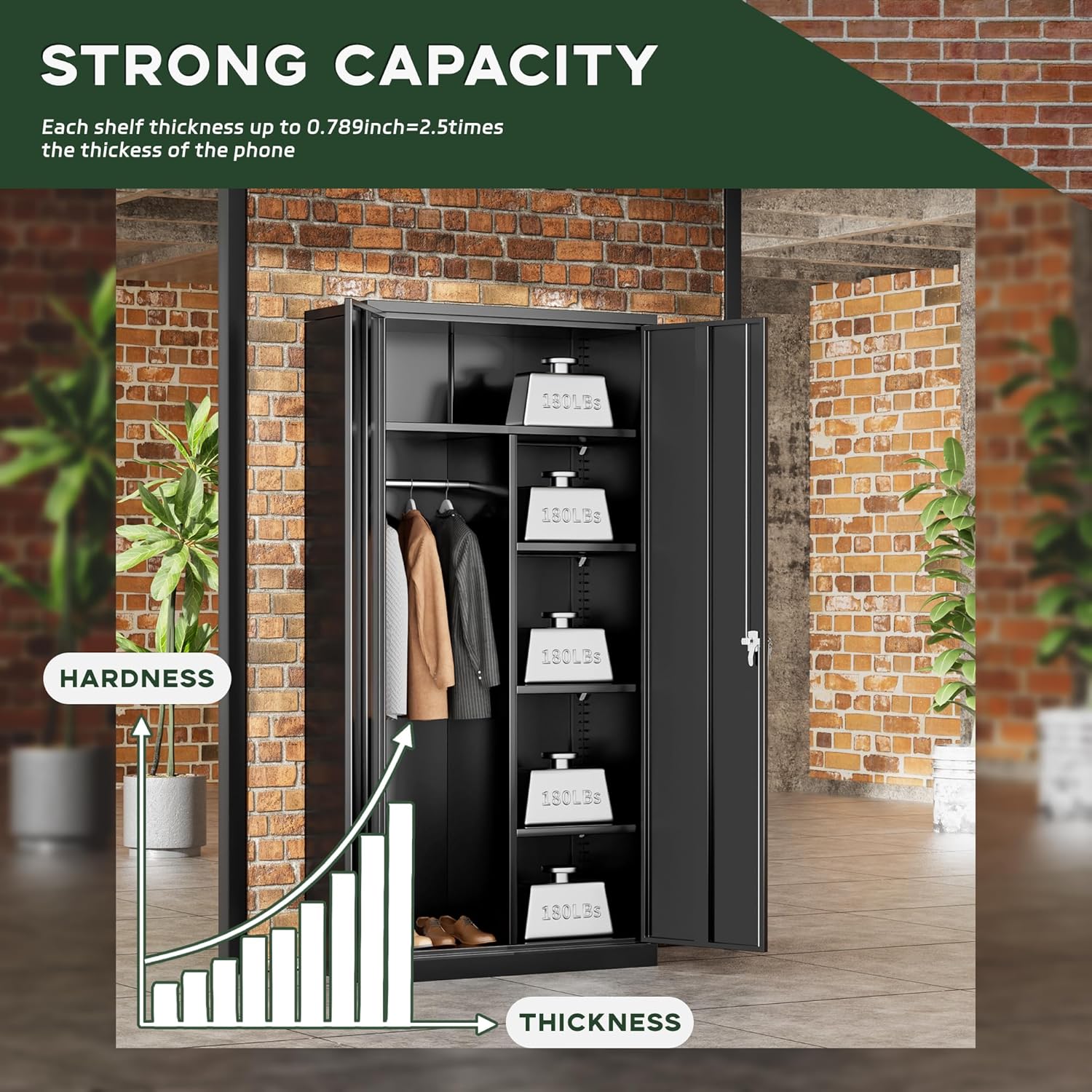 - [ Durable Load-bearing Design ]: Greenvelly metal wardrobe cabinet features a sturdy load-bearing design, made of high-grade cold-rolled steel plates with a thickness of up to 0.8mm. The large shelf can stably carry a heavy load of 180 pounds, while the small shelf can safely support 120 pounds, ensuring the stability of the structure. In addition, metal wardrobe cabinet with hanging bars is made of thickened steel, allowing you to say goodbye to the worry of clothing damage during storage.