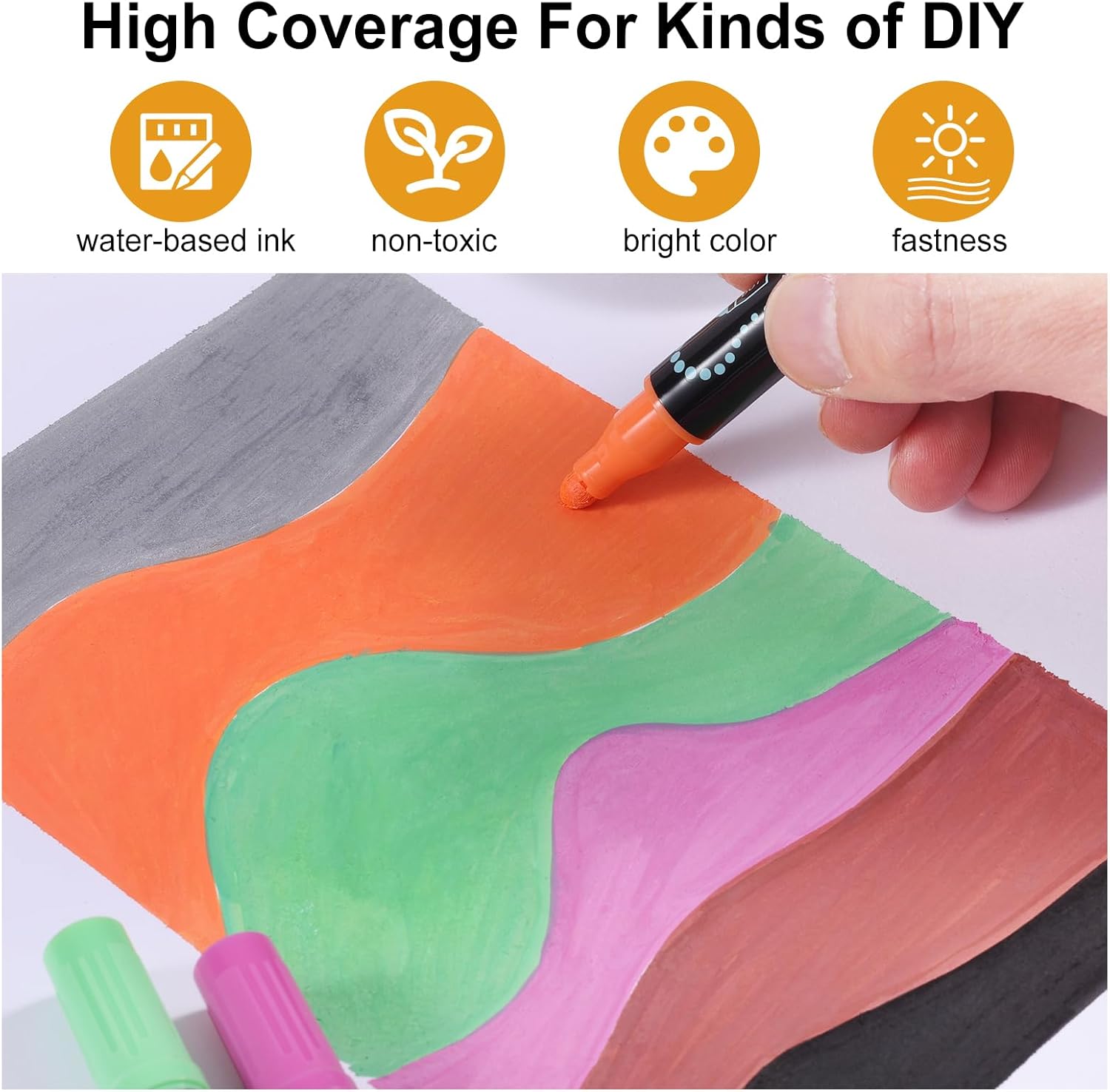 - Upgraded Waterproof and Easy to Use: Our new acrylic paint set do not require shaking or pressing the pen tip to release ink—just open the lid and start using them directly! Coloring Markers set are made with water-based ink, which providing a smooth, consistent application with even ink flow for a more effortless painting experience. The resulting artworks are brightly colored, waterproof, fade-resistant, and sun-resistant, making them ideal for long-term preservation.