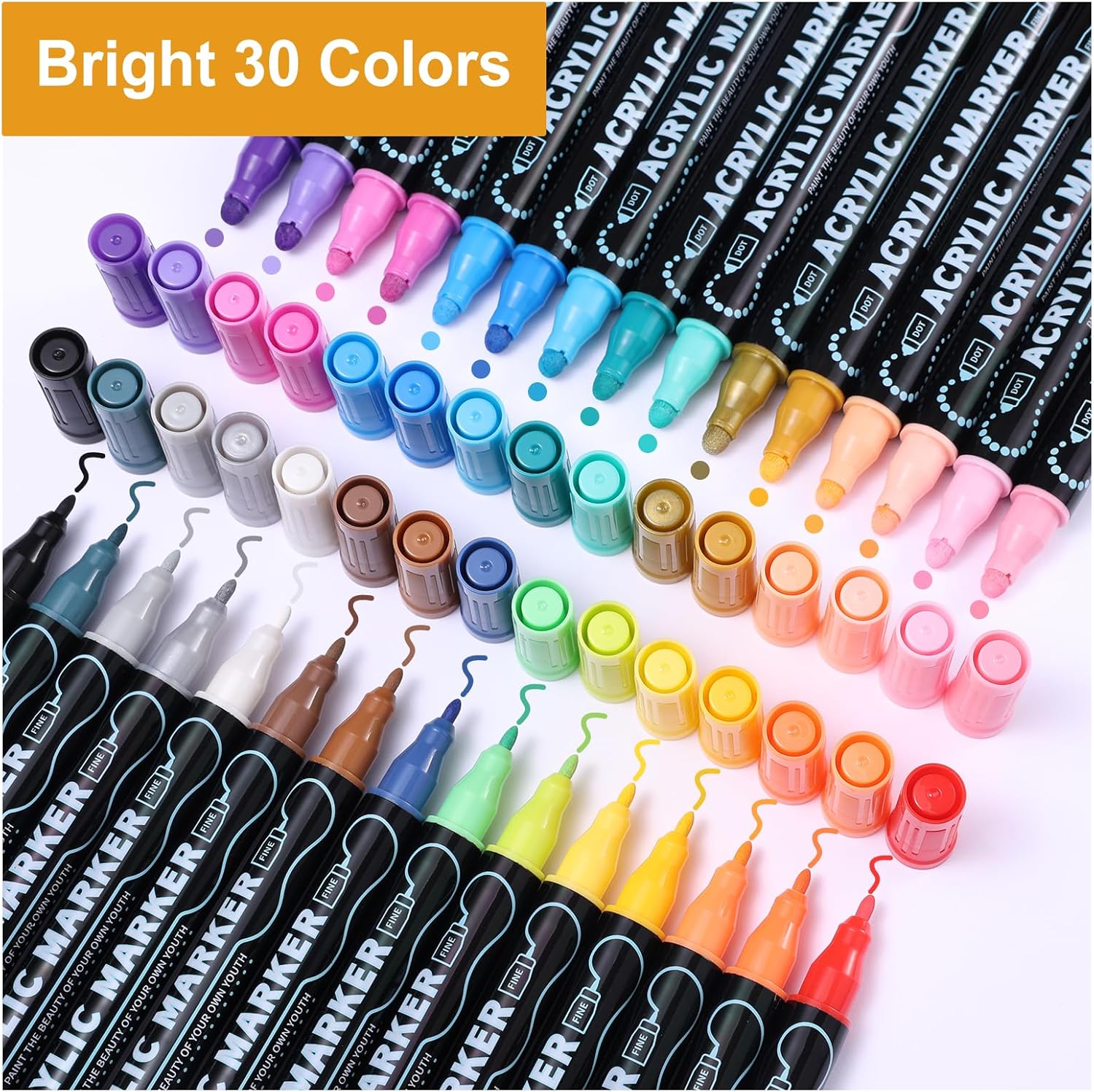 30 Colors Waterproof Dual Tip Acrylic Paint Pens, Dot & Fine Tip Premium Coloring Drawing Markers Set for Wood, Rock Painting, Canvas, Glass, Ceramic Surfaces and DIY Crafts Making Art Supplies
