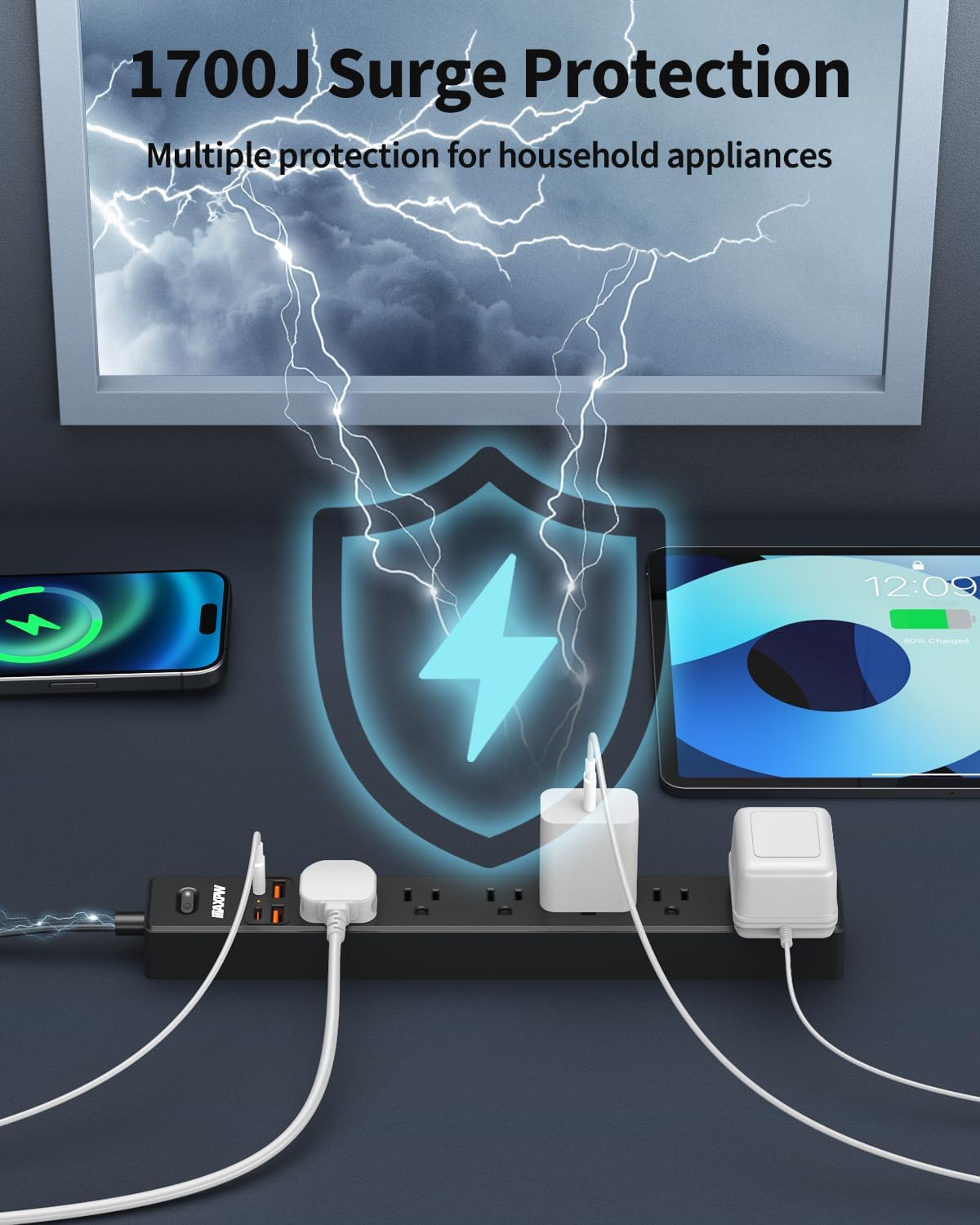 - 【Handles All Your Needs】- Our 10-foot power strip features 7 sockets and 4 USB slots (including 2 Type-C), transforming a single outlet into 11. Power up to 11 devices simultaneously, saving you valuable time and streamlining your setup.