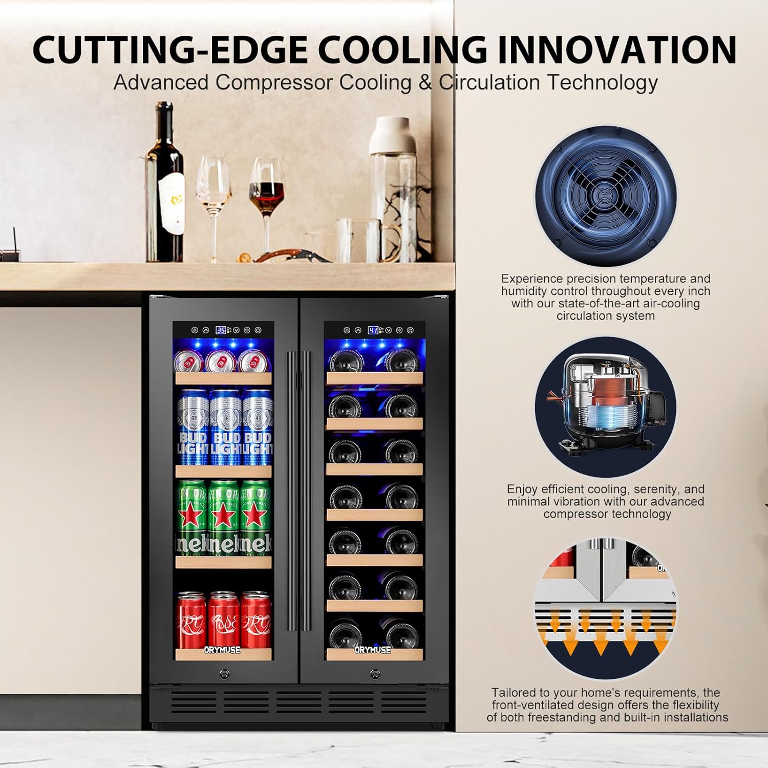 24" Dual Zone Wine & Beverage Refrigerator – Under Counter Cooler with Upgraded Cooling & Blue LED Light, Hold 20 Bottles and 88 Cans Large Capacity Wine Fridge, Built-In or Freestanding – Black