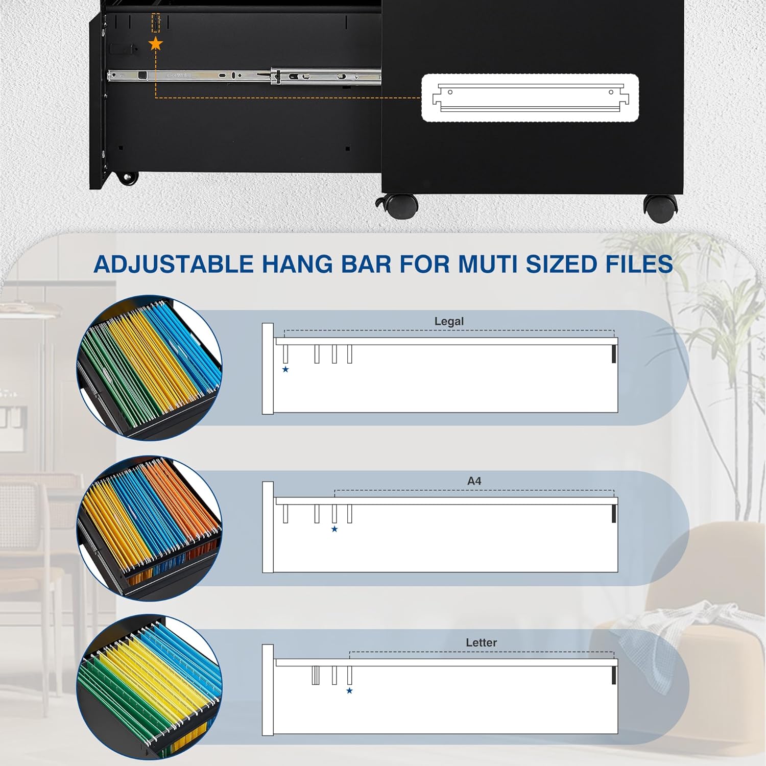 - MOVABLE FILE CABINET - With the five 360°rotating foot wheels on the filling cabinet, your can easily move this metal file cabinet, and all the wheels are made of high-strength plastic, which can support metal cabinets filled with files.