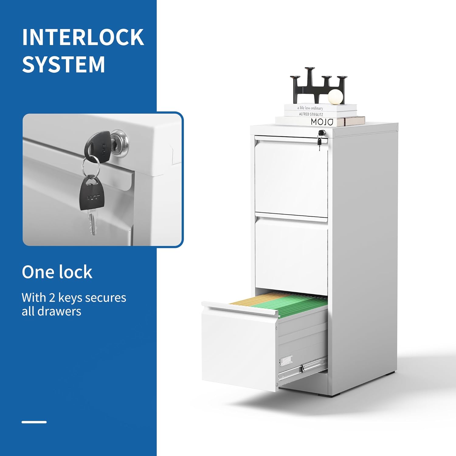 - ăAnti-tilt DesignăThis vertical legal file cabinet designed with full extension and steel ball-bearing suspension, all drawers of the file cabinets can be opened and closed quietly and easily. The anti-tilt system ensures that only one drawer can be open at a time, preventing the metal file cabinet from tipping over. You can have peace of mind knowing that your important documents and items are safe and secure.
