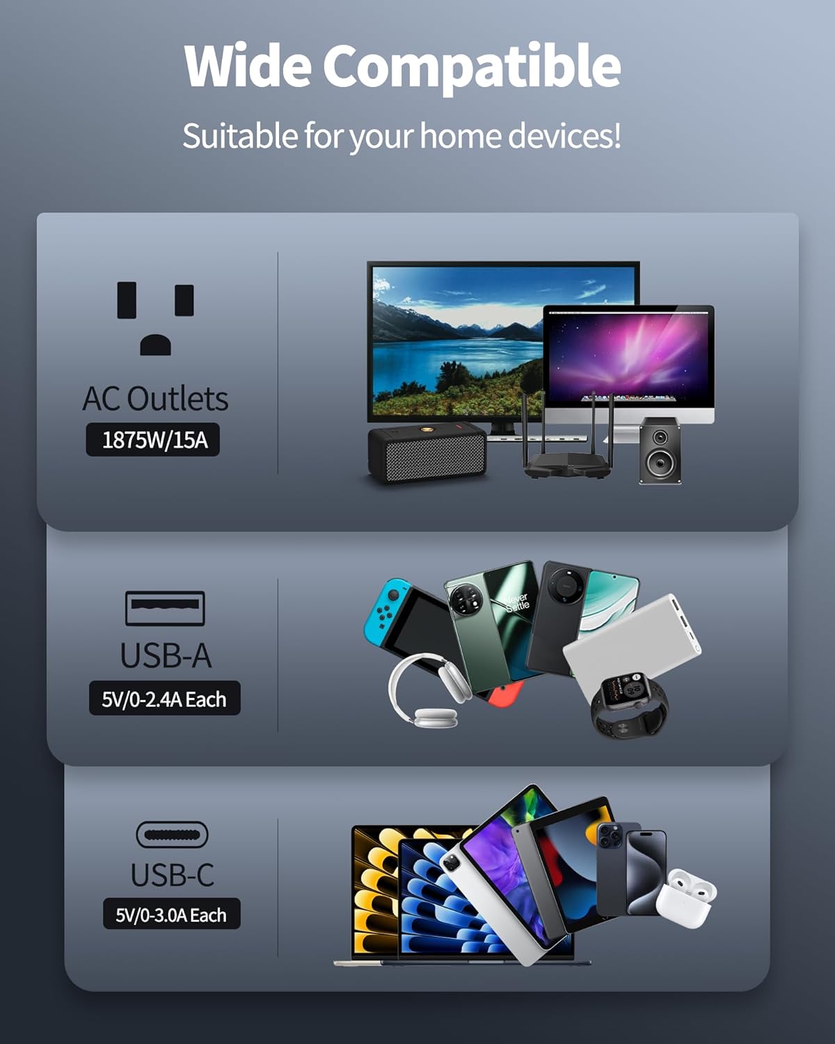 - 【Power for All】-Features 24 grounded outlets, 4 USB-A ports, and 2 USB-C ports to allow you to power up your gaming or media setup, computer, laptop, phone, and camera at the same time. One charging station for a clutter-free desk.
