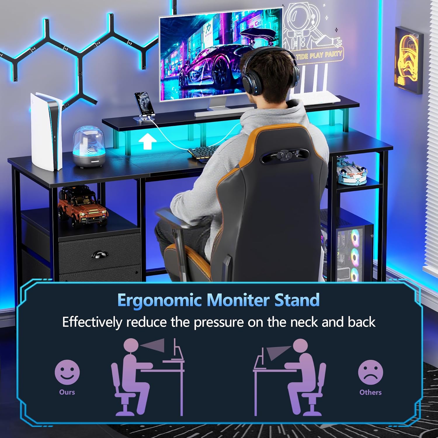 Furologee 61" Gaming Desk with Power Outlets & LED Lights, Reversible Computer Desk with File Cabinet & Monitor Stand for Home Office, Large Work Table with Storage Shelves & Drawer, Black