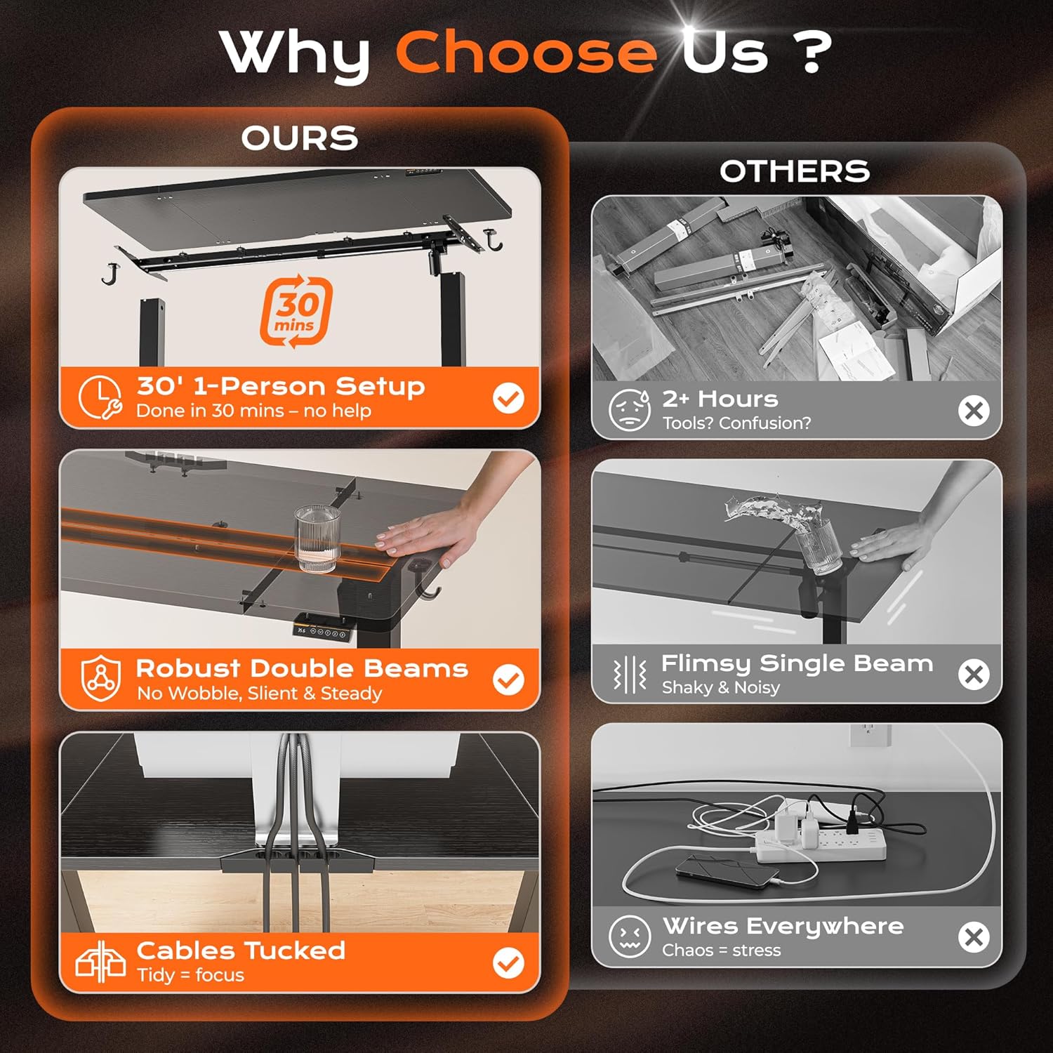 - ăAdvanced Safety FeaturesăEquipped with anti-collision technology, the stand desk automatically reverses direction upon encountering an obstacle, protecting your belongings and ensuring safe operation. Adjustable feet below the adjustable desk keep it stable anytime, anywhere