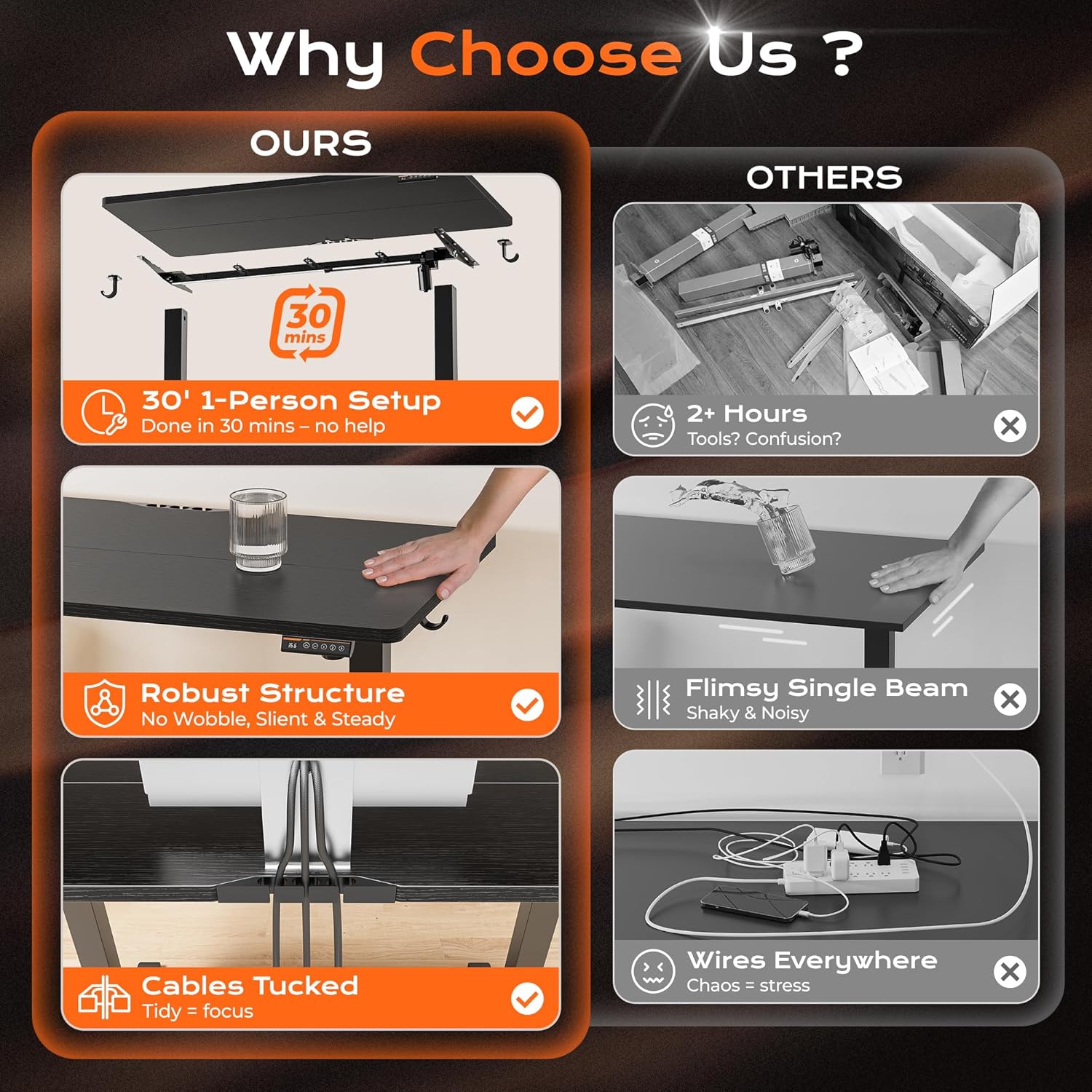 - ăBuilt to Last with Exceptional StabilityăThe industrial-grade steel frame and T-shaped design of the stand up desk support up to 220 lbs, ensuring stability and reliability for years to come. Paired with a durable motor, this home office desk is designed to meet the demands of your dynamic workday