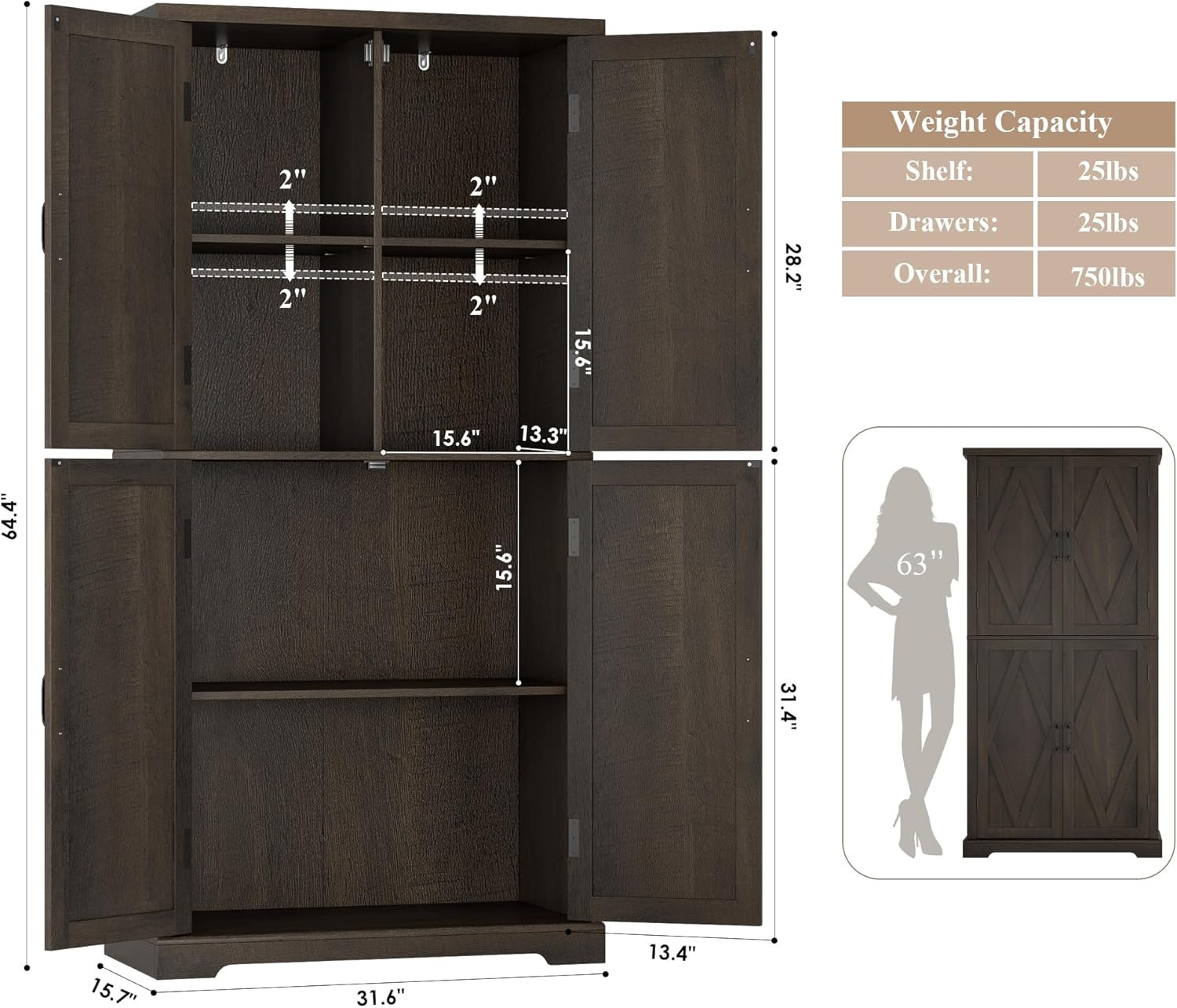 - Built To Last: Made of high-grade manufactured wood and robust metal handle, this pantry storage cabinet stands out in durability and stability and can withstand years of use. The surface of white body is painted for beauty and easy maintenance. Overall size: 15.7"D x 31.5"W x 64.3"H, Weight Capacity: 350 lbs