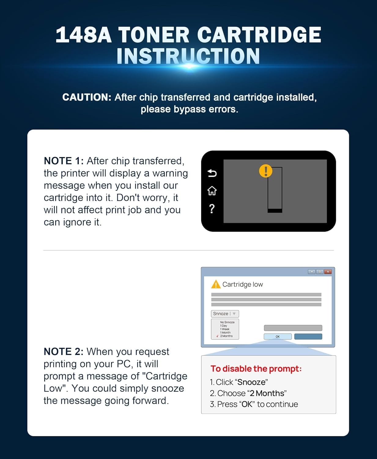 - No Chip: Make sure you have the OEM 148A toner cartridge and follow the instructions to remove it from OEM toner and install it to our product (𝐘𝐨𝐮 𝐜𝐨𝐮𝐥𝐝 𝐟𝐢𝐧𝐝 𝐭𝐡𝐞 𝐢𝐧𝐬𝐭𝐫𝐮𝐜𝐭𝐢𝐨𝐧𝐬 𝐢𝐧 𝐬𝐢𝐝𝐞 𝐩𝐢𝐜𝐭𝐮𝐫𝐞 𝐚𝐧𝐝 𝐀+ 𝐜𝐨𝐧𝐭𝐞𝐧𝐭)