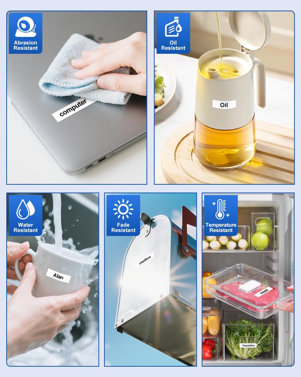 - Features: Our laminated 12mm 0.47" White label maker tape split design makes the label tape easy to peel and apply, with strong adhesion/waterproof/temperature/oil/abrasion/fading, and reliably sticking to various surfaces