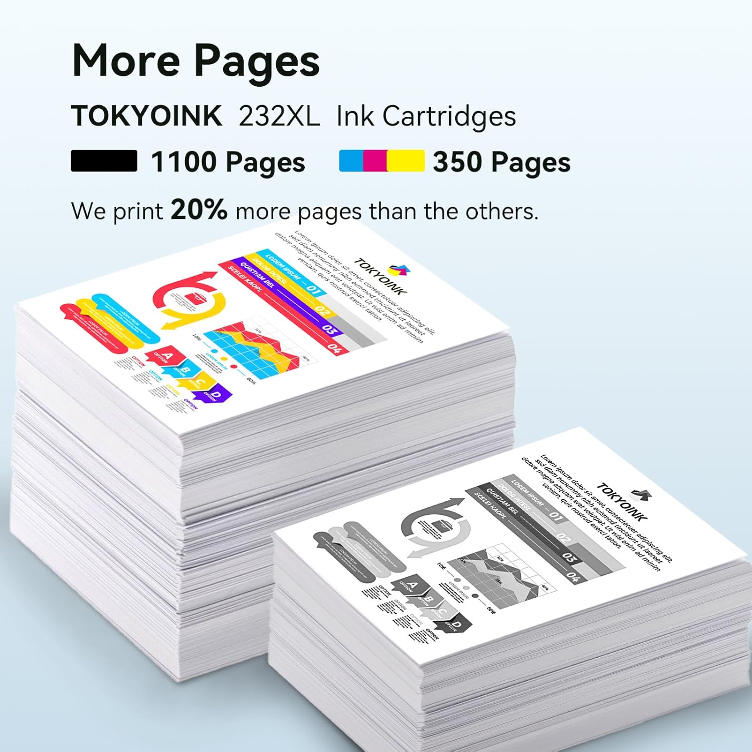 - TOKYOINK 232xl ink cartridges for printer High page yield with 1100 pages printouts per 232XL black ink cartridge and 350 pages per 232XL color ink cartridges at 5% coverage (A4/letter)