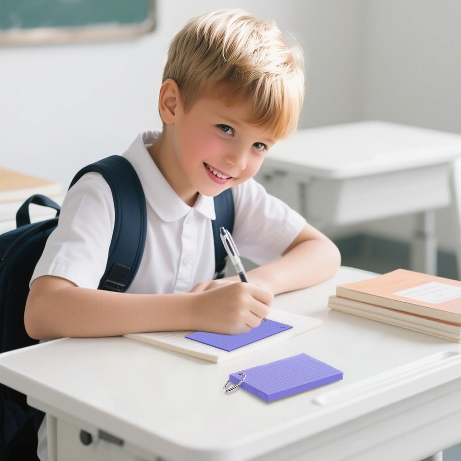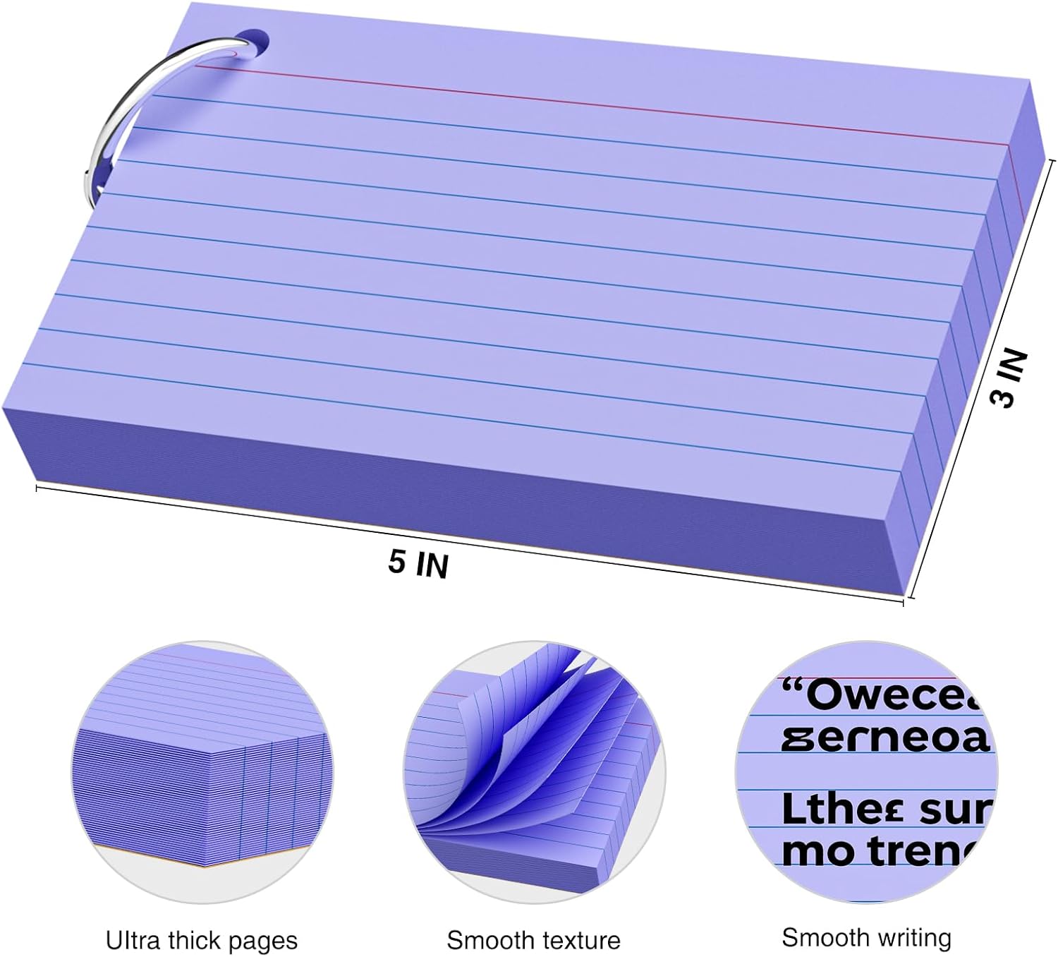 250 Count Purple Index Cards 3x5 Inch with Key Ring, Color Flash Index Card (50 Sheets Each), Durable & Portable Note Taking for Students, Teachers, Study Note Cards for Office Home School