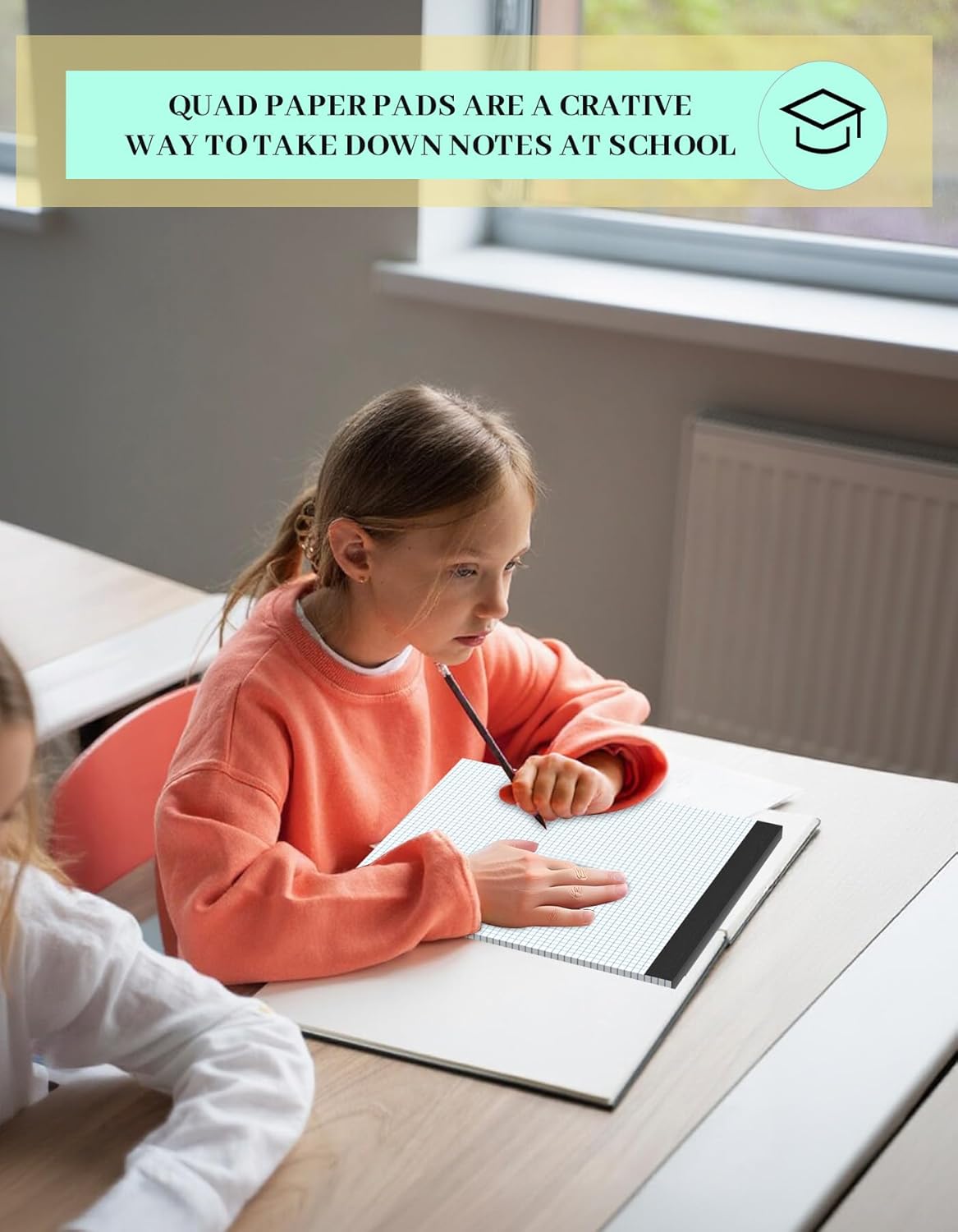 - 【STURDY CARDBOAD BACKER】: These white quadrille paper pad 8.5 x 11 are equipped with thicker, stronger cardboard pad on the backer board, ensure stability and hand-writing on the go, doesn't slip out of hands easily, perfect for holding a pen and writing in various environment. Graph paper sheets are secured by the black binding. The writing tablets 8.5 x 11 can be torn off a page quickly and cleanly without leaving any crumbs.