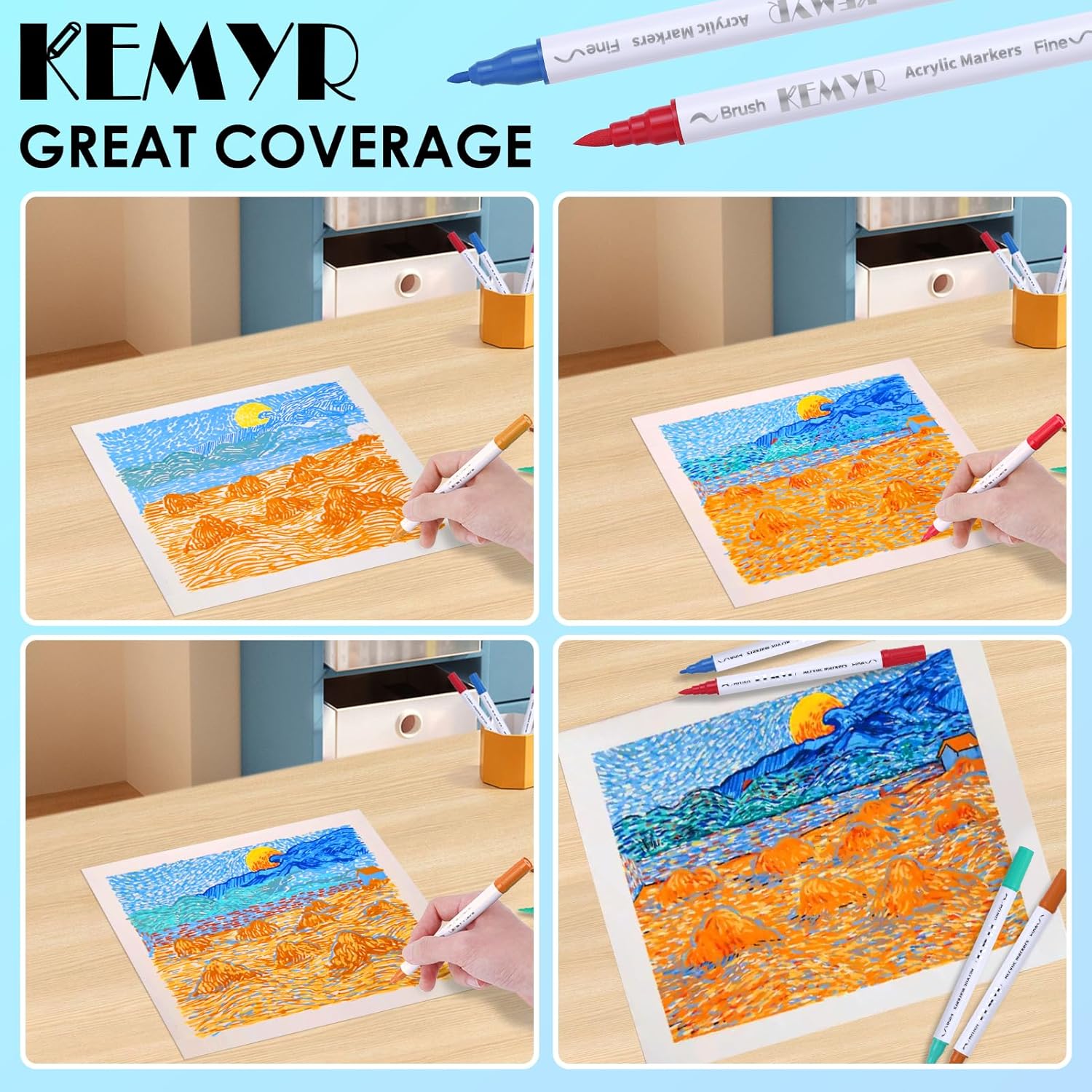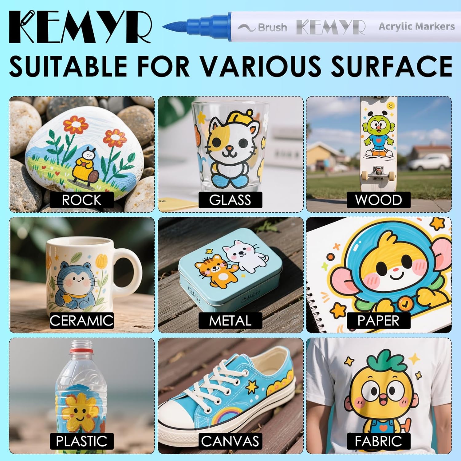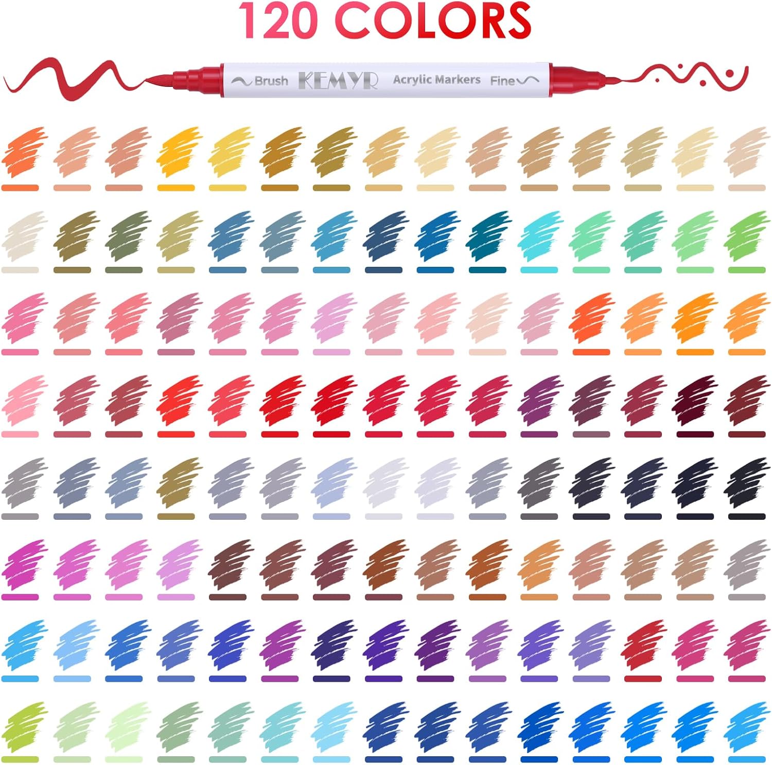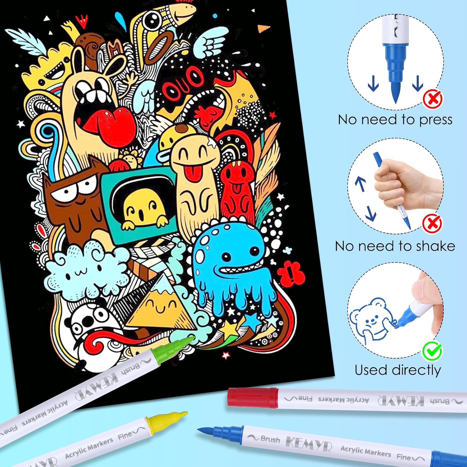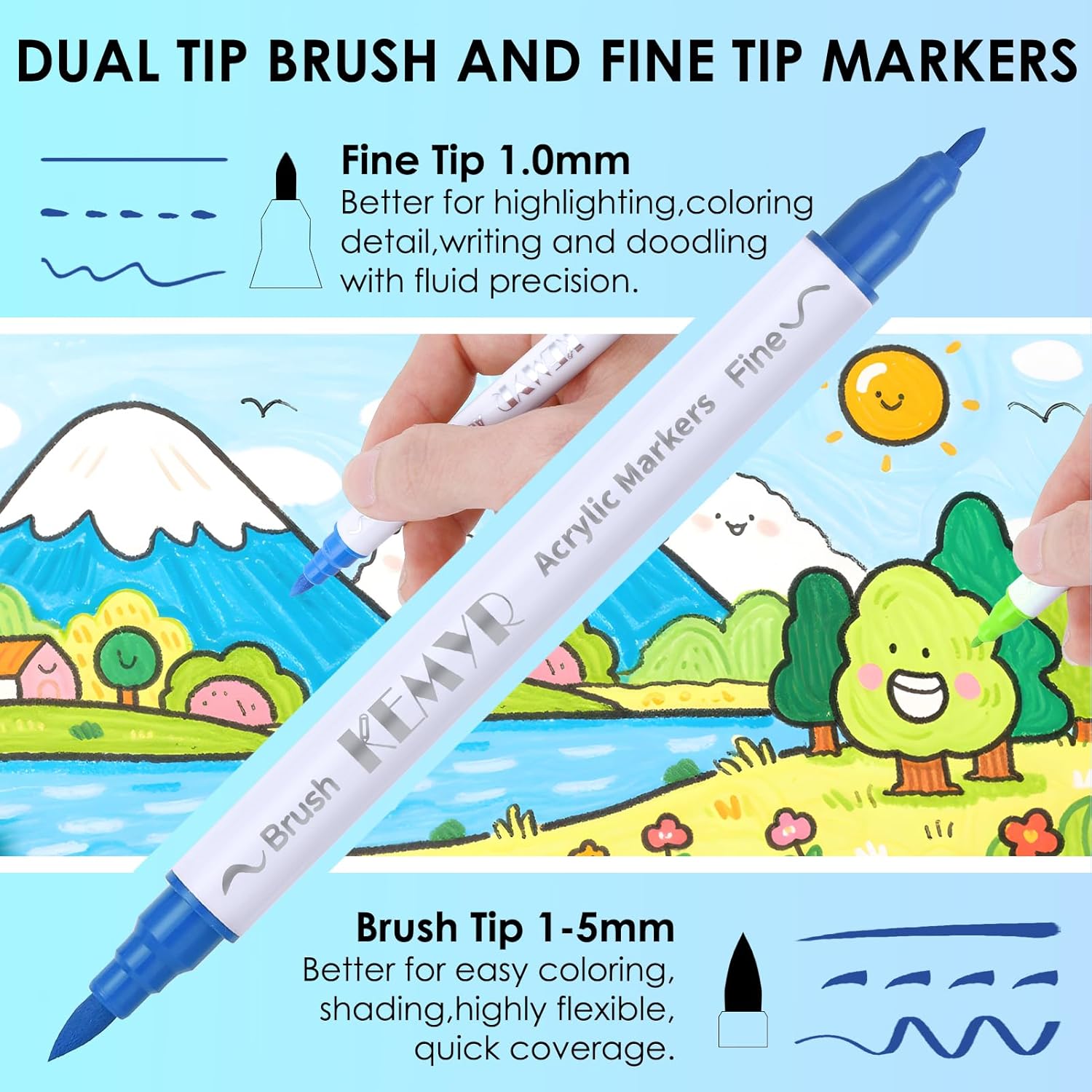 - Dual Tip Acrylic Paint Pens----Each KEMYR pen is equipped with a 1 mm fine tip for lines and details work, and a 1 - 5 mm brush tip for filling large areas and coloring. By changing the brush pressure, you can create different strokes, saving the trouble of changing tips.