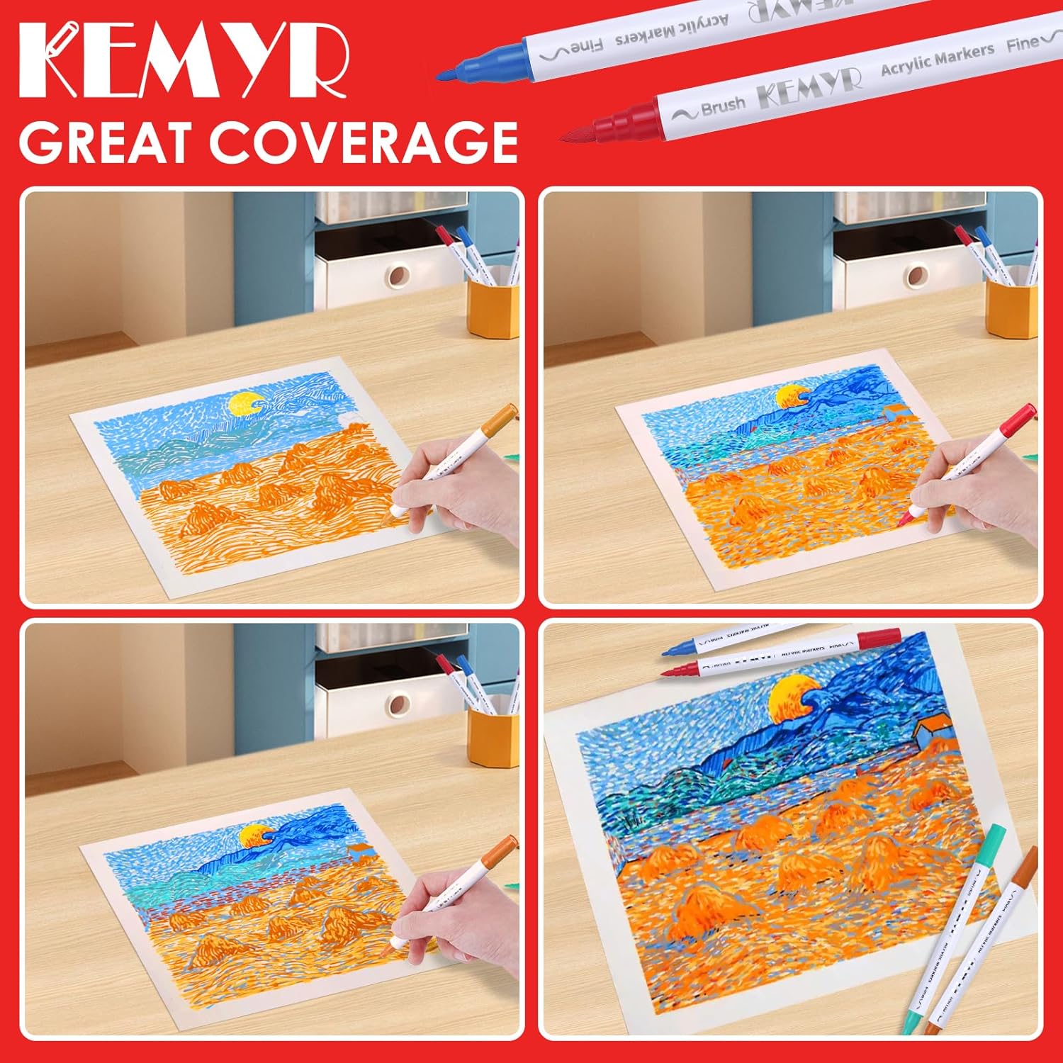 - Dual Tip Acrylic Paint Pens----Each KEMYR pen is equipped with a 1 mm fine tip for lines and details work, and a 1 - 5 mm brush tip for filling large areas and coloring. By changing the brush pressure, you can create different strokes, saving the trouble of changing tips.