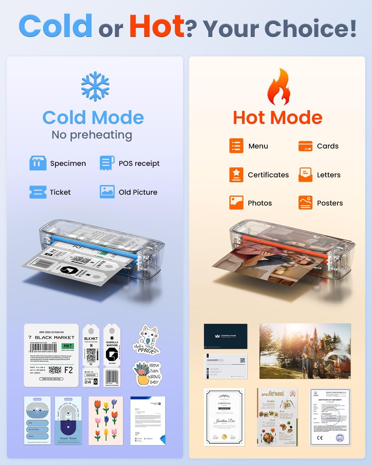 - Smart Hot & Cold Modes: thermal laminator seals at a constant 85Β°C, creating a waterproof, scratch-resistant protective layer, ideal for thick paper, certificates, and long-term preservation. Cold mode bonds materials and film through mechanical pressure, preventing heat damage, perfect for sensitive items like photos, receipts, and labels. (Note: Cold mode requires self-adhesive pouches, not included.)