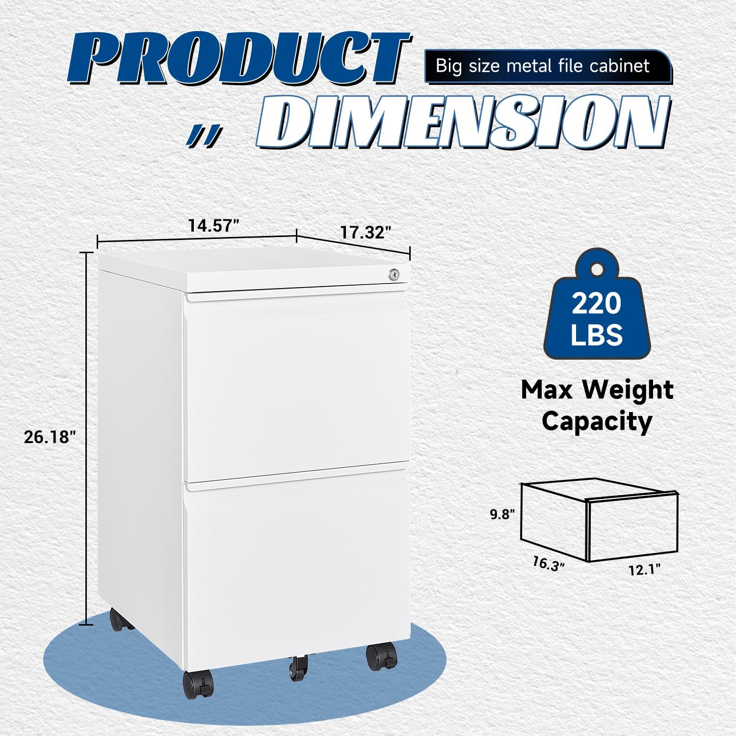 2 Drawers Vertical File Cabinet - Fully Assembled White Under Desk Mobile Filling Cabinet Small Lockable Home Office File Cabinets for A4/Letter/Legal Size