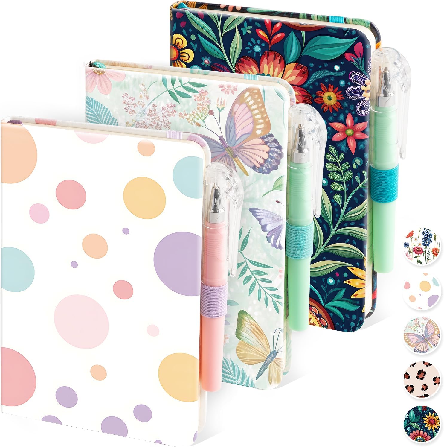 - Assorted set of 3 aesthetic pocket notebooks, with beautiful colors and charming floral patterns. Cute appearance makes writing fun, our small journals make your daily life full of energy. This set includes three small notebooks and 3 small pens, with waterproof leather covers, and each notebook has 66 sheets lined pages