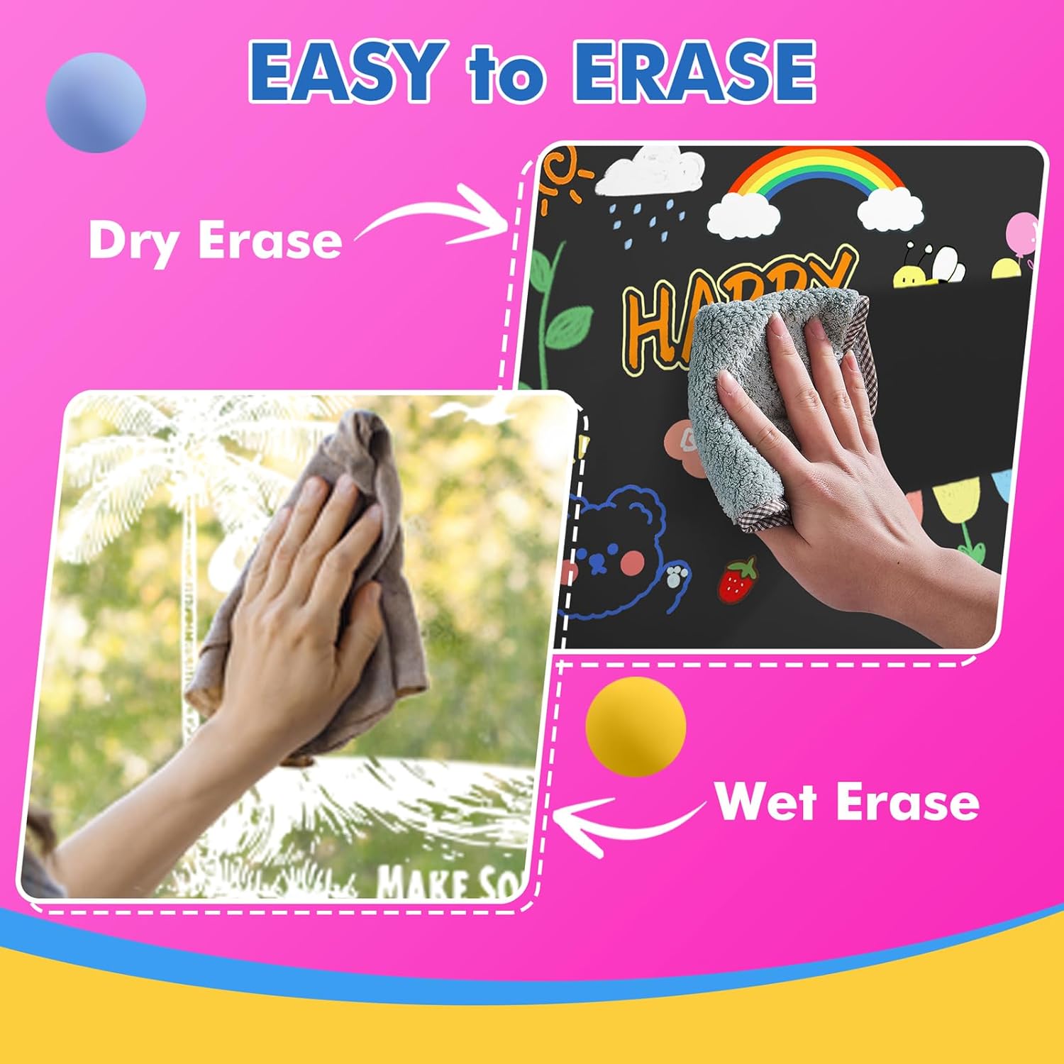- Dry&Wet Erase:Chalk board marker pens feature newly upgraded water-based ink for bold,vibrant colors that wipe off easily with a damp cloth.Plus,they're washable for quick cleanup.Let your creativity shine and bring your ideas to life with bright, eye-catching colors!