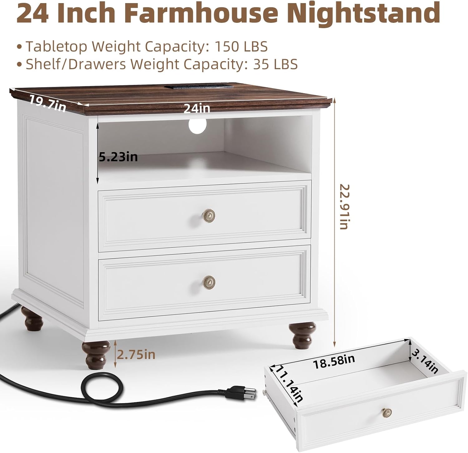 - [Huge Storage Space]This side table with charging station has a spacious 24" tabletop and large-capacity double drawers, combining functions of storage and display. You can organize high-frequency items or decorations in an orderly manner and enhance the style of your bedroom. The drawers of the wood nightstand are equipped with smooth and silent metal rails and round knob handles for your daily use.Size:19.76"D x 24"W x 22.91"H.