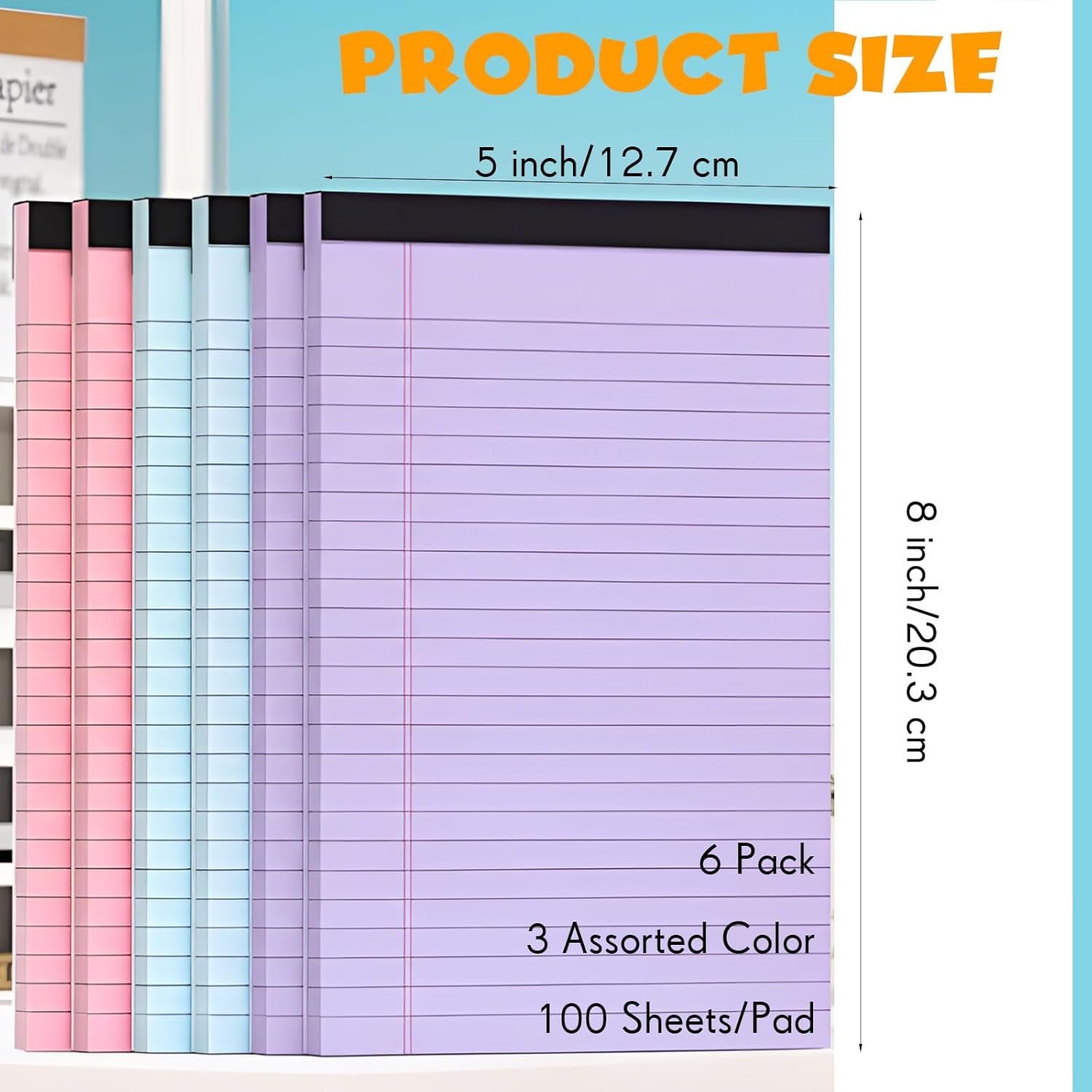 - Colored Legal Pads: the package contains 6 notepads, each with 100 sheets, a total of 600 sheets, with a size of about 5 x 8 inches, and is available in three colors: blue, purple, and pink, with two of each color; There are double red vertical lines on the left side of the notebook to help you better classify and organize your notes, and there is also ample space on the top for you to record to-do items or shopping lists