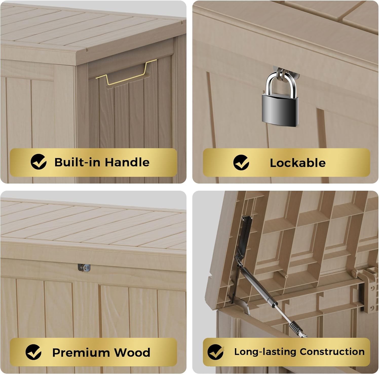 - Material: The patio outdoor storage box is made of the latest high-quality resin material, which makes this patio deck storage box waterproof, UV-resistant, anti-fading, and anti-bending protection, suitable for long-term outdoor use.
