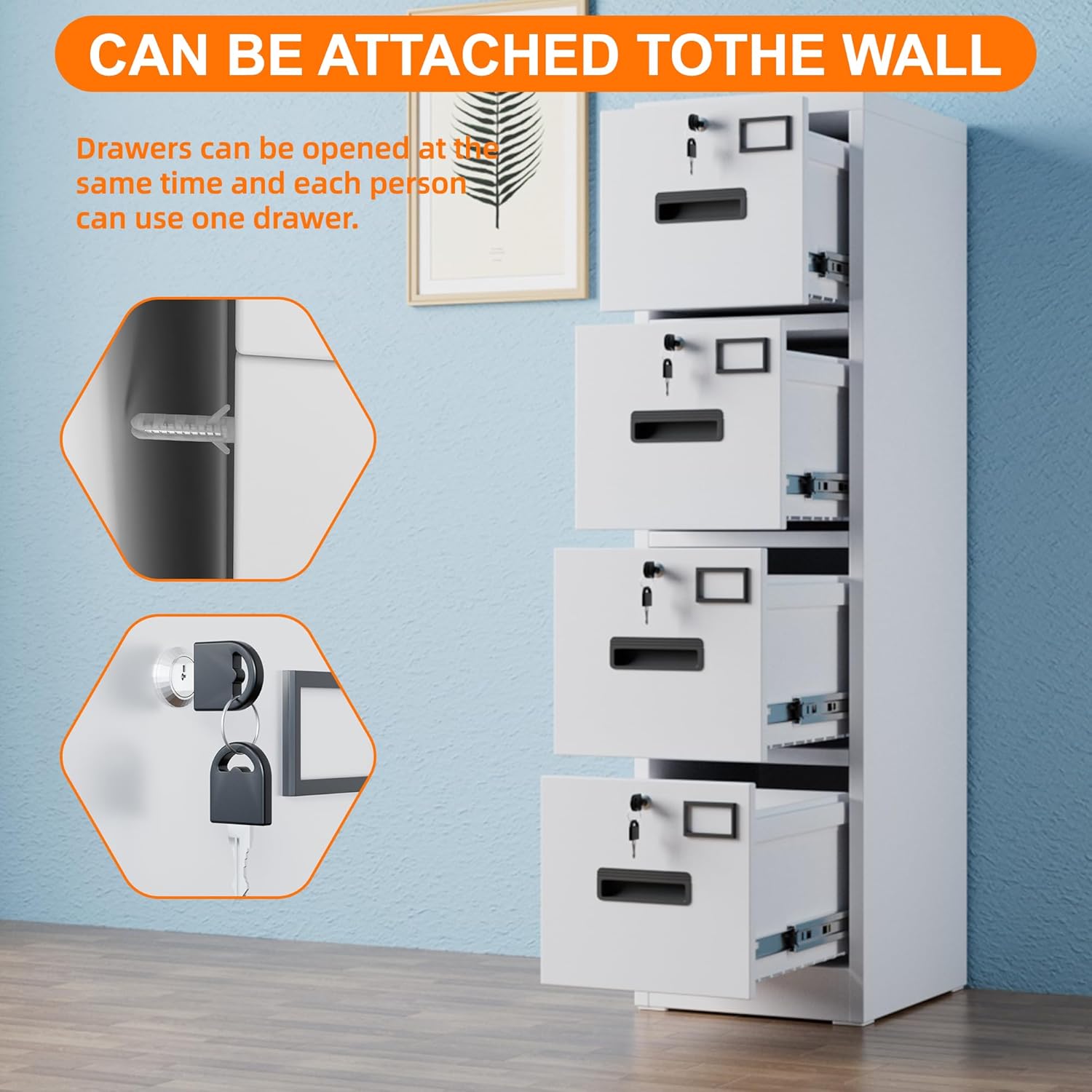 - Independent Locks for Each Drawer with Secure Keys: Each drawer of the file cabinet is equipped with its own independent lock and a set of keys, providing a secure and private space for your sensitive documents. This feature ensures that each drawer can be individually secured, giving you peace of mind about the safety of your important files. Also, all the drawers can be opened at the same time;