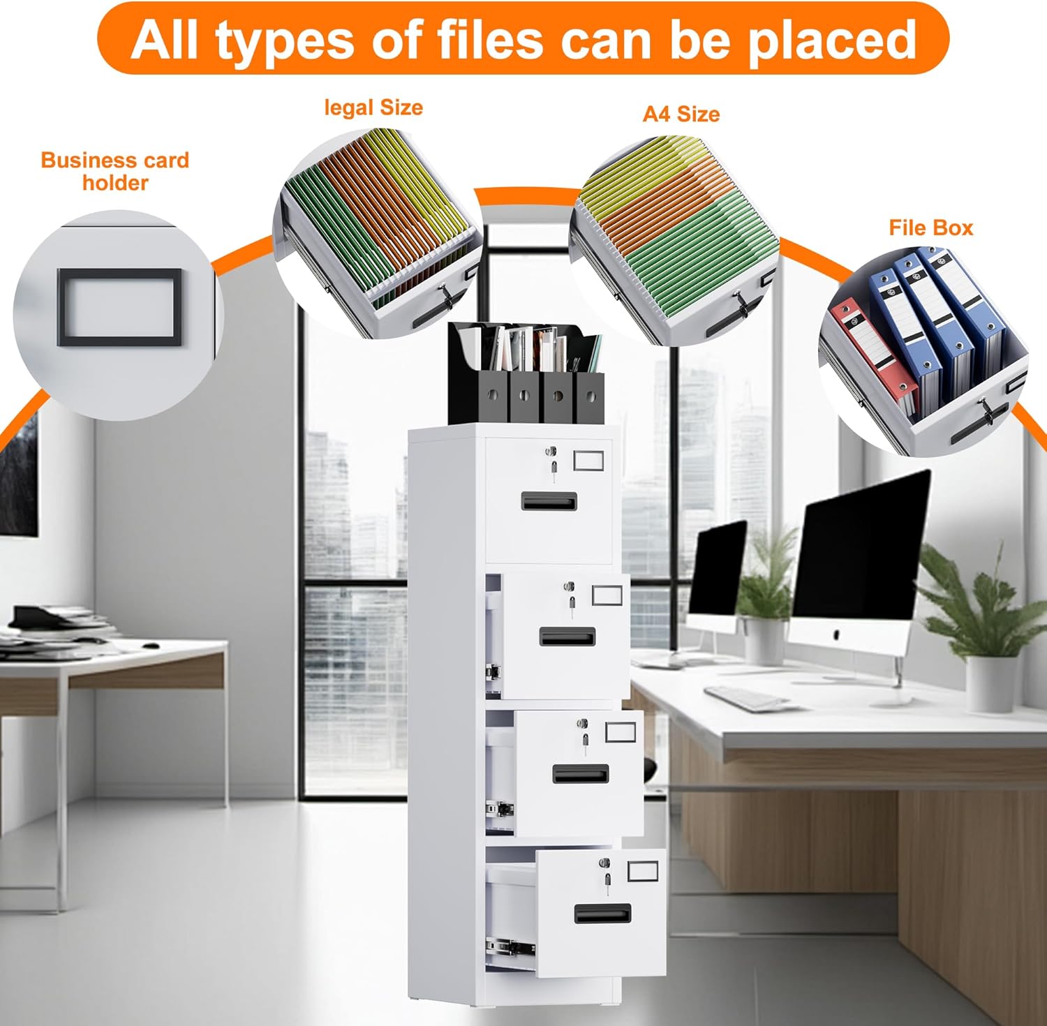4 Drawer File Cabinet with 4 Independent Locks, Metal Vertical Filing Storage Cabinet for Home Office with Card Holder for Letter/Legal/A4 Folders, Assembly Required, 4 Drawers, White