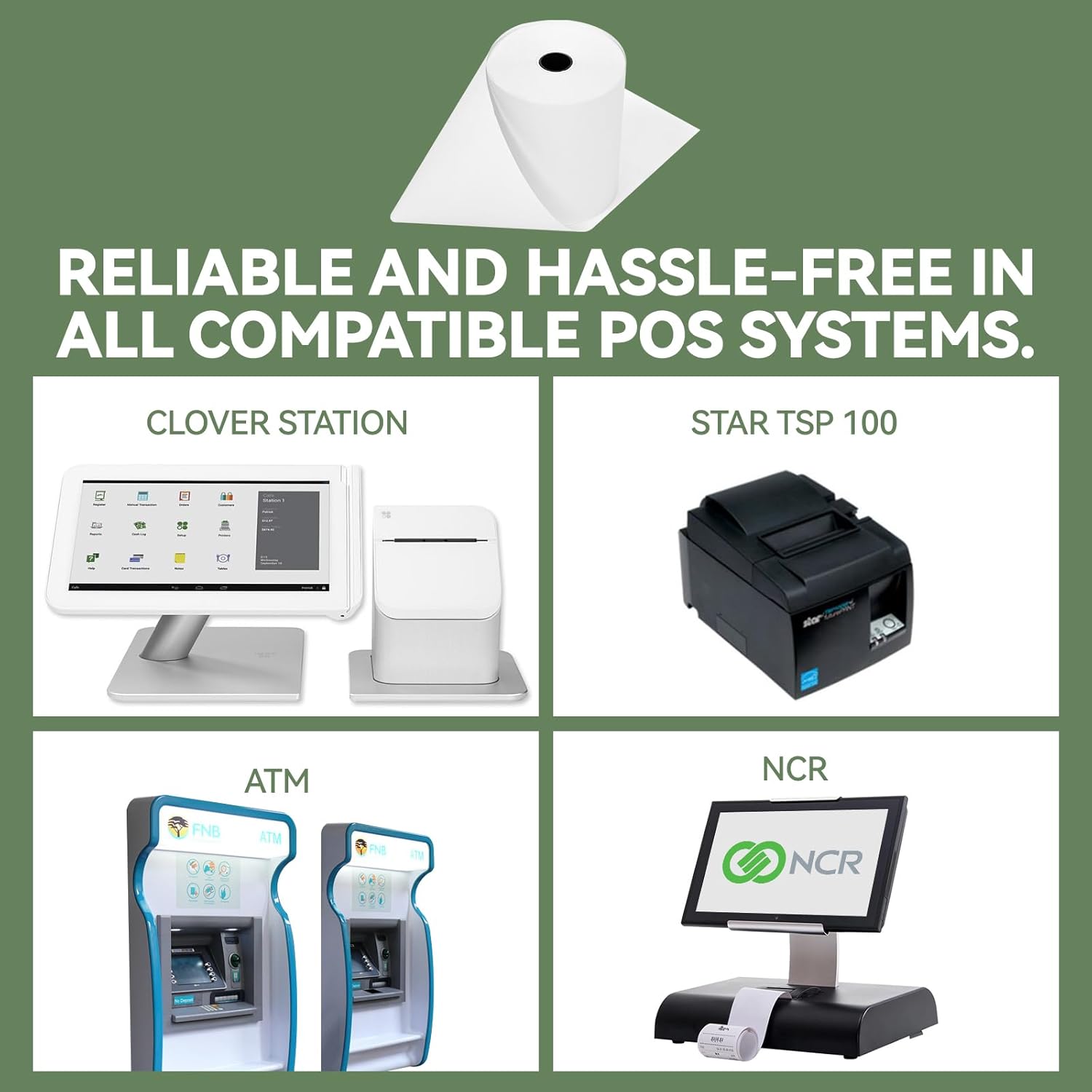 - Universal Compatibility: 3 1/8" x 230' rolls fit most popular thermal receipt printers (like Epson, Star, Clover, Verifone, etc.).